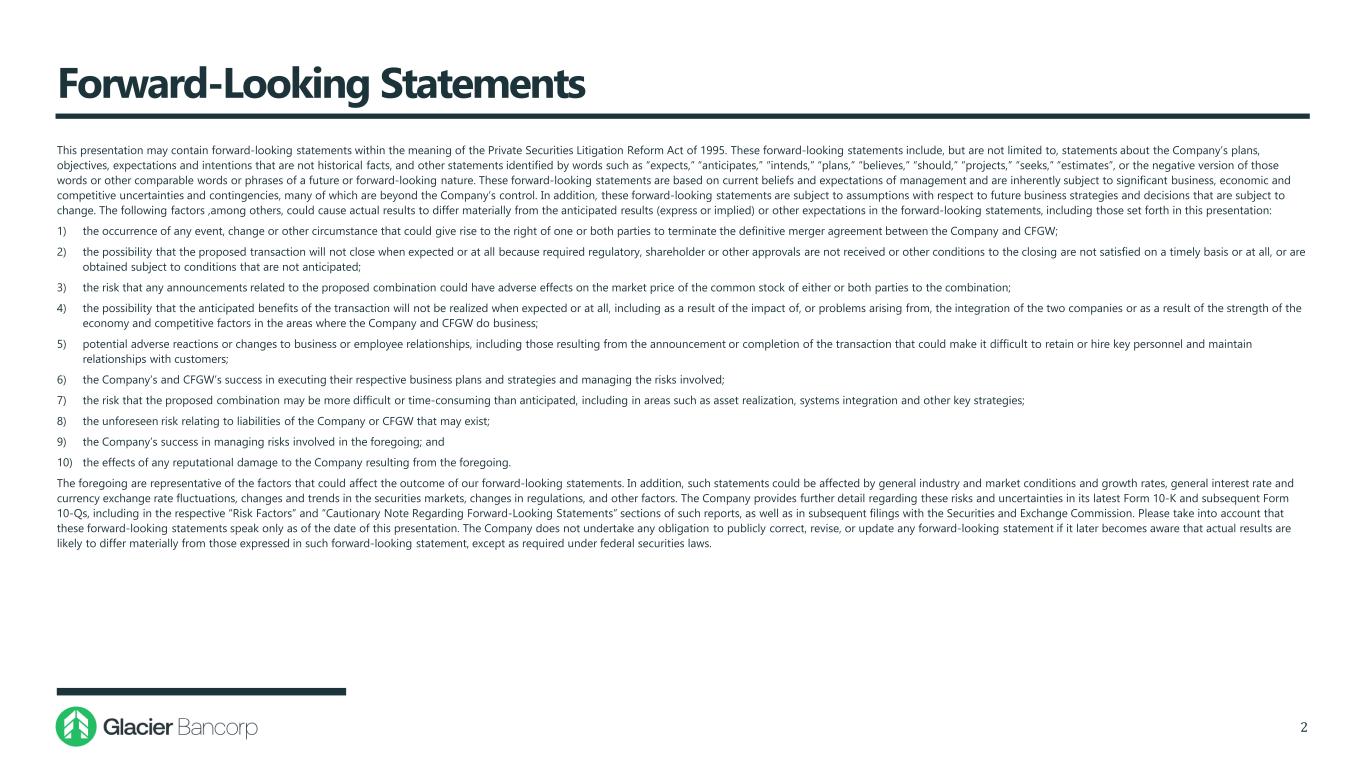 Forward-Looking Statements This presentation may contain forward-looking statements within the meaning of the Private Securities Litigation Reform Act of 1995. These forward-looking statements include, but are not limited to, statements about the Company’s plans, objectives, expectations and intentions that are not historical facts, and other statements identified by words such as “expects,” “anticipates,” “intends,” “plans,” “believes,” “should,” “projects,” “seeks,” “estimates”, or the negative version of those words or other comparable words or phrases of a future or forward-looking nature. These forward-looking statements are based on current beliefs and expectations of management and are inherently subject to significant business, economic and competitive uncertainties and contingencies, many of which are beyond the Company’s control. In addition, these forward-looking statements are subject to assumptions with respect to future business strategies and decisions that are subject to change. The following factors ,among others, could cause actual results to differ materially from the anticipated results (express or implied) or other expectations in the forward-looking statements, including those set forth in this presentation: 1) the occurrence of any event, change or other circumstance that could give rise to the right of one or both parties to terminate the definitive merger agreement between the Company and CFGW; 2) the possibility that the proposed transaction will not close when expected or at all because required regulatory, shareholder or other approvals are not received or other conditions to the closing are not satisfied on a timely basis or at all, or are obtained subject to conditions that are not anticipated; 3) the risk that any announcements related to the proposed combination could have adverse effects on the market price of the common stock of either or both parties to the combination; 4) the possibility that the anticipated benefits of the transaction will not be realized when expected or at all, including as a result of the impact of, or problems arising from, the integration of the two companies or as a result of the strength of the economy and competitive factors in the areas where the Company and CFGW do business; 5) potential adverse reactions or changes to business or employee relationships, including those resulting from the announcement or completion of the transaction that could make it difficult to retain or hire key personnel and maintain relationships with customers; 6) the Company’s and CFGW’s success in executing their respective business plans and strategies and managing the risks involved; 7) the risk that the proposed combination may be more difficult or time-consuming than anticipated, including in areas such as asset realization, systems integration and other key strategies; 8) the unforeseen risk relating to liabilities of the Company or CFGW that may exist; 9) the Company’s success in managing risks involved in the foregoing; and 10) the effects of any reputational damage to the Company resulting from the foregoing. The foregoing are representative of the factors that could affect the outcome of our forward-looking statements. In addition, such statements could be affected by general industry and market conditions and growth rates, general interest rate and currency exchange rate fluctuations, changes and trends in the securities markets, changes in regulations, and other factors. The Company provides further detail regarding these risks and uncertainties in its latest Form 10-K and subsequent Form 10-Qs, including in the respective “Risk Factors” and “Cautionary Note Regarding Forward-Looking Statements” sections of such reports, as well as in subsequent filings with the Securities and Exchange Commission. Please take into account that these forward-looking statements speak only as of the date of this presentation. The Company does not undertake any obligation to publicly correct, revise, or update any forward-looking statement if it later becomes aware that actual results are likely to differ materially from those expressed in such forward-looking statement, except as required under federal securities laws. 2