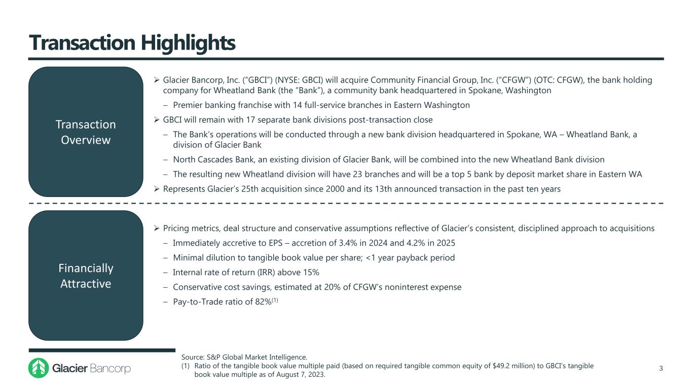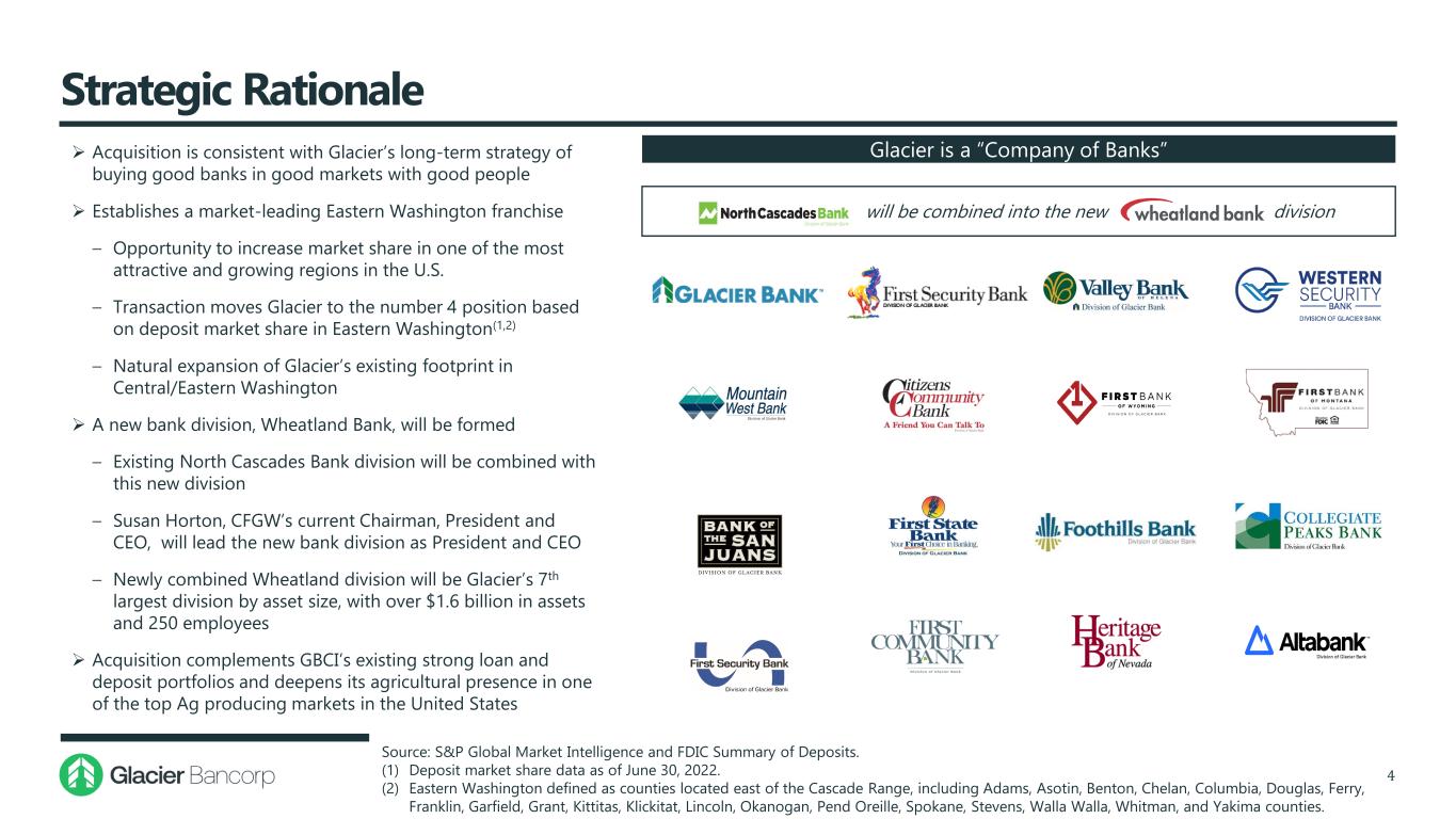 Transaction Highlights 3 Transaction Overview Financially Attractive  Glacier Bancorp, Inc. (“GBCI”) (NYSE: GBCI) will acquire Community Financial Group, Inc. (“CFGW”) (OTC: CFGW), the bank holding company for Wheatland Bank (the “Bank”), a community bank headquartered in Spokane, Washington ‒ Premier banking franchise with 14 full-service branches in Eastern Washington  GBCI will remain with 17 separate bank divisions post-transaction close ‒ The Bank’s operations will be conducted through a new bank division headquartered in Spokane, WA – Wheatland Bank, a division of Glacier Bank ‒ North Cascades Bank, an existing division of Glacier Bank, will be combined into the new Wheatland Bank division ‒ The resulting new Wheatland division will have 23 branches and will be a top 5 bank by deposit market share in Eastern WA  Represents Glacier’s 25th acquisition since 2000 and its 13th announced transaction in the past ten years  Pricing metrics, deal structure and conservative assumptions reflective of Glacier’s consistent, disciplined approach to acquisitions ‒ Immediately accretive to EPS – accretion of 3.4% in 2024 and 4.2% in 2025 ‒ Minimal dilution to tangible book value per share; <1 year payback period ‒ Internal rate of return (IRR) above 15% ‒ Conservative cost savings, estimated at 20% of CFGW’s noninterest expense ‒ Pay-to-Trade ratio of 82%(1) Source: S&P Global Market Intelligence. (1) Ratio of the tangible book value multiple paid (based on required tangible common equity of $49.2 million) to GBCI’s tangible book value multiple as of August 7, 2023.