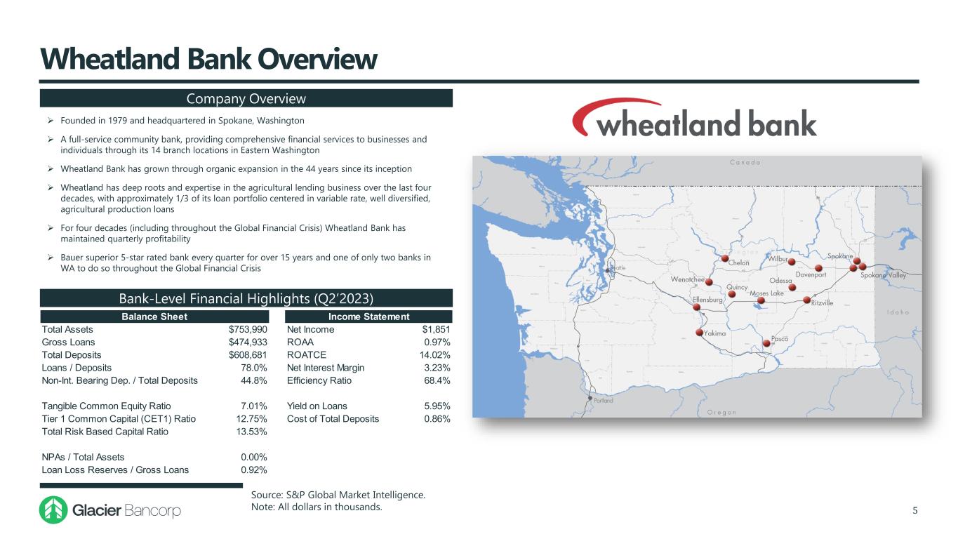 Strategic Rationale 4 Glacier is a “Company of Banks” Acquisition is consistent with Glacier’s long-term strategy of buying good banks in good markets with good people  Establishes a market-leading Eastern Washington franchise ‒ Opportunity to increase market share in one of the most attractive and growing regions in the U.S. ‒ Transaction moves Glacier to the number 4 position based on deposit market share in Eastern Washington(1,2) ‒ Natural expansion of Glacier’s existing footprint in Central/Eastern Washington  A new bank division, Wheatland Bank, will be formed ‒ Existing North Cascades Bank division will be combined with this new division ‒ Susan Horton, CFGW’s current Chairman, President and CEO, will lead the new bank division as President and CEO ‒ Newly combined Wheatland division will be Glacier’s 7th largest division by asset size, with over $1.6 billion in assets and 250 employees  Acquisition complements GBCI’s existing strong loan and deposit portfolios and deepens its agricultural presence in one of the top Ag producing markets in the United States Source: S&P Global Market Intelligence and FDIC Summary of Deposits. (1) Deposit market share data as of June 30, 2022. (2) Eastern Washington defined as counties located east of the Cascade Range, including Adams, Asotin, Benton, Chelan, Columbia, Douglas, Ferry, Franklin, Garfield, Grant, Kittitas, Klickitat, Lincoln, Okanogan, Pend Oreille, Spokane, Stevens, Walla Walla, Whitman, and Yakima counties. will be combined into the new division