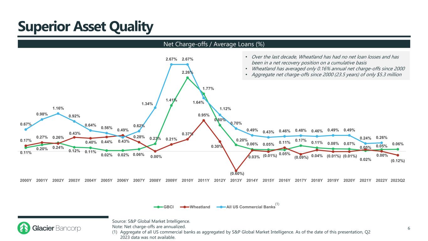 Wheatland Bank Overview 5  Founded in 1979 and headquartered in Spokane, Washington  A full-service community bank, providing comprehensive financial services to businesses and individuals through its 14 branch locations in Eastern Washington  Wheatland Bank has grown through organic expansion in the 44 years since its inception  Wheatland has deep roots and expertise in the agricultural lending business over the last four decades, with approximately 1/3 of its loan portfolio centered in variable rate, well diversified, agricultural production loans  For four decades (including throughout the Global Financial Crisis) Wheatland Bank has maintained quarterly profitability  Bauer superior 5-star rated bank every quarter for over 15 years and one of only two banks in WA to do so throughout the Global Financial Crisis Bank-Level Financial Highlights (Q2’2023) Company Overview Source: S&P Global Market Intelligence. Note: All dollars in thousands. Total Assets $753,990 Net Income $1,851 Gross Loans $474,933 ROAA 0.97% Total Deposits $608,681 ROATCE 14.02% Loans / Deposits 78.0% Net Interest Margin 3.23% Non-Int. Bearing Dep. / Total Deposits 44.8% Efficiency Ratio 68.4% Tangible Common Equity Ratio 7.01% Yield on Loans 5.95% Tier 1 Common Capital (CET1) Ratio 12.75% Cost of Total Deposits 0.86% Total Risk Based Capital Ratio 13.53% NPAs / Total Assets 0.00% Loan Loss Reserves / Gross Loans 0.92% Balance Sheet Income Statement