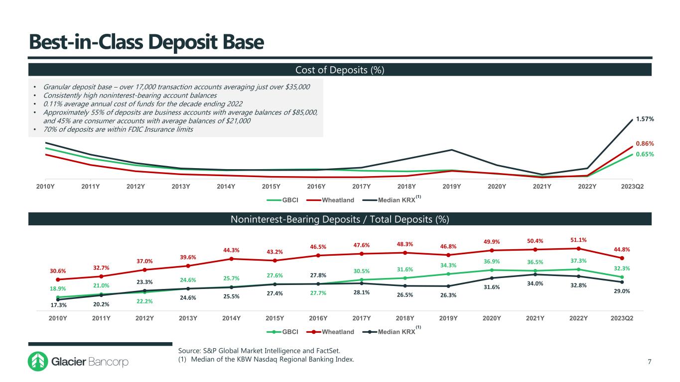 Superior Asset Quality 6 Source: S&P Global Market Intelligence. Note: Net charge-offs are annualized. (1) Aggregate of all US commercial banks as aggregated by S&P Global Market Intelligence. As of the date of this presentation, Q2 2023 data was not available. Net Charge-offs / Average Loans (%) 0.11% 0.20% 0.26% 0.12% 0.11% 0.02% 0.02% 0.06% 0.23% 1.41% 2.26% 1.77% 0.80% 0.20% 0.06% 0.05% 0.05% 0.17% 0.11% 0.08% 0.07% 0.02% 0.05% 0.06% 0.17% 0.27% 0.24% 0.43% 0.40% 0.44% 0.49% 0.28% 0.00% 0.21% 0.37% 0.95% 0.30% (0.60%) 0.03% (0.01%) 0.11% (0.09%) 0.04% (0.01%) (0.01%) 0.05% 0.00% (0.12%) 0.67% 0.98% 1.16% 0.92% 0.64% 0.56% 0.43% 0.62% 1.34% 2.67% 2.67% 1.64% 1.12% 0.70% 0.49% 0.43% 0.46% 0.48% 0.46% 0.49% 0.49% 0.24% 0.26% 2000Y 2001Y 2002Y 2003Y 2004Y 2005Y 2006Y 2007Y 2008Y 2009Y 2010Y 2011Y 2012Y 2013Y 2014Y 2015Y 2016Y 2017Y 2018Y 2019Y 2020Y 2021Y 2022Y 2023Q2 GBCI Wheatland All US Commercial Banks (1) • Over the last decade, Wheatland has had no net loan losses and has been in a net recovery position on a cumulative basis • Wheatland has averaged only 0.16% annual net charge-offs since 2000 • Aggregate net charge-offs since 2000 (23.5 years) of only $5.3 million