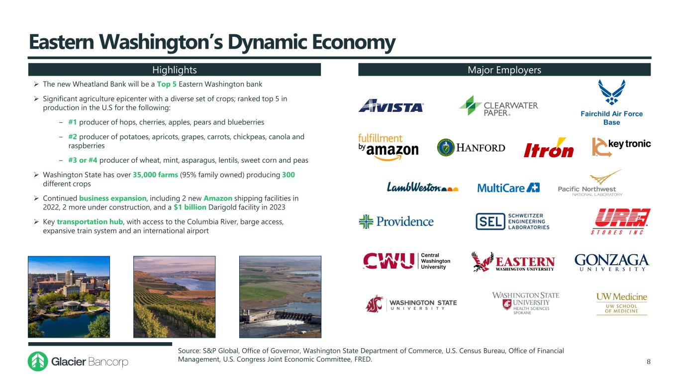 Eastern Washington’s Dynamic Economy 8 Source: S&P Global, Office of Governor, Washington State Department of Commerce, U.S. Census Bureau, Office of Financial Management, U.S. Congress Joint Economic Committee, FRED. Major EmployersHighlights  The new Wheatland Bank will be a Top 5 Eastern Washington bank  Significant agriculture epicenter with a diverse set of crops; ranked top 5 in production in the U.S for the following: ‒ #1 producer of hops, cherries, apples, pears and blueberries ‒ #2 producer of potatoes, apricots, grapes, carrots, chickpeas, canola and raspberries ‒ #3 or #4 producer of wheat, mint, asparagus, lentils, sweet corn and peas  Washington State has over 35,000 farms (95% family owned) producing 300 different crops  Continued business expansion, including 2 new Amazon shipping facilities in 2022, 2 more under construction, and a $1 billion Darigold facility in 2023  Key transportation hub, with access to the Columbia River, barge access, expansive train system and an international airport Fairchild Air Force Base