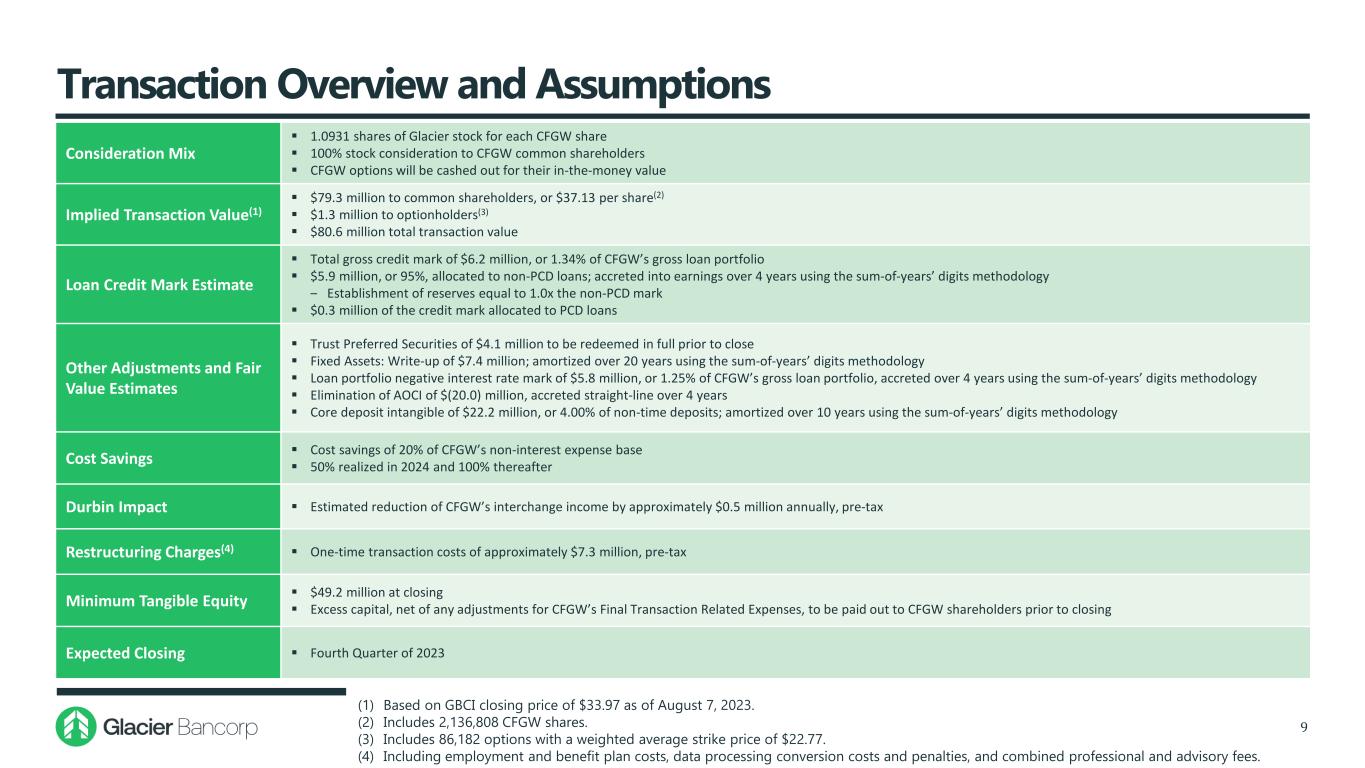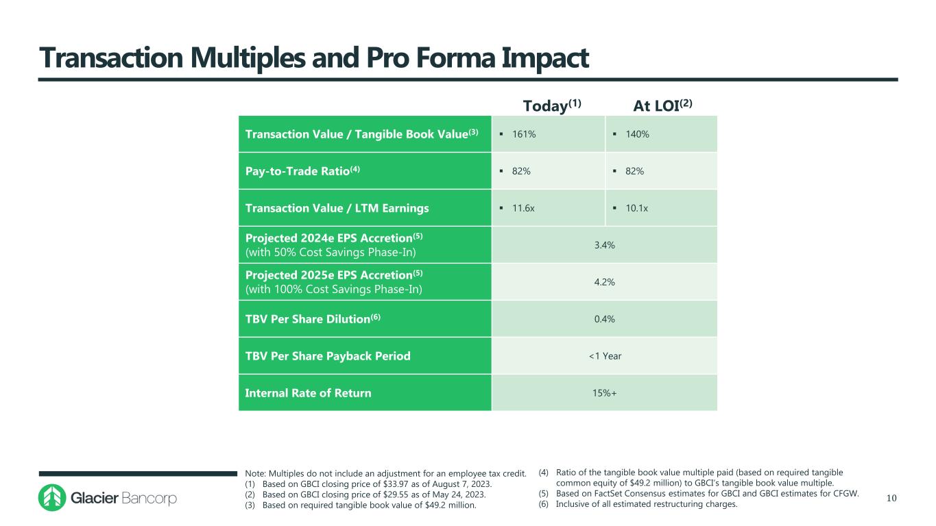 Transaction Overview and Assumptions 9 Consideration Mix  1.0931 shares of Glacier stock for each CFGW share  100% stock consideration to CFGW common shareholders  CFGW options will be cashed out for their in-the-money value Implied Transaction Value(1)  $79.3 million to common shareholders, or $37.13 per share(2)  $1.3 million to optionholders(3)  $80.6 million total transaction value Loan Credit Mark Estimate  Total gross credit mark of $6.2 million, or 1.34% of CFGW’s gross loan portfolio  $5.9 million, or 95%, allocated to non-PCD loans; accreted into earnings over 4 years using the sum-of-years’ digits methodology ‒ Establishment of reserves equal to 1.0x the non-PCD mark  $0.3 million of the credit mark allocated to PCD loans Other Adjustments and Fair Value Estimates  Trust Preferred Securities of $4.1 million to be redeemed in full prior to close  Fixed Assets: Write-up of $7.4 million; amortized over 20 years using the sum-of-years’ digits methodology  Loan portfolio negative interest rate mark of $5.8 million, or 1.25% of CFGW’s gross loan portfolio, accreted over 4 years using the sum-of-years’ digits methodology  Elimination of AOCI of $(20.0) million, accreted straight-line over 4 years  Core deposit intangible of $22.2 million, or 4.00% of non-time deposits; amortized over 10 years using the sum-of-years’ digits methodology Cost Savings  Cost savings of 20% of CFGW’s non-interest expense base  50% realized in 2024 and 100% thereafter Durbin Impact  Estimated reduction of CFGW’s interchange income by approximately $0.5 million annually, pre-tax Restructuring Charges(4)  One-time transaction costs of approximately $7.3 million, pre-tax Minimum Tangible Equity  $49.2 million at closing  Excess capital, net of any adjustments for CFGW’s Final Transaction Related Expenses, to be paid out to CFGW shareholders prior to closing Expected Closing  Fourth Quarter of 2023 (1) Based on GBCI closing price of $33.97 as of August 7, 2023. (2) Includes 2,136,808 CFGW shares. (3) Includes 86,182 options with a weighted average strike price of $22.77. (4) Including employment and benefit plan costs, data processing conversion costs and penalties, and combined professional and advisory fees.