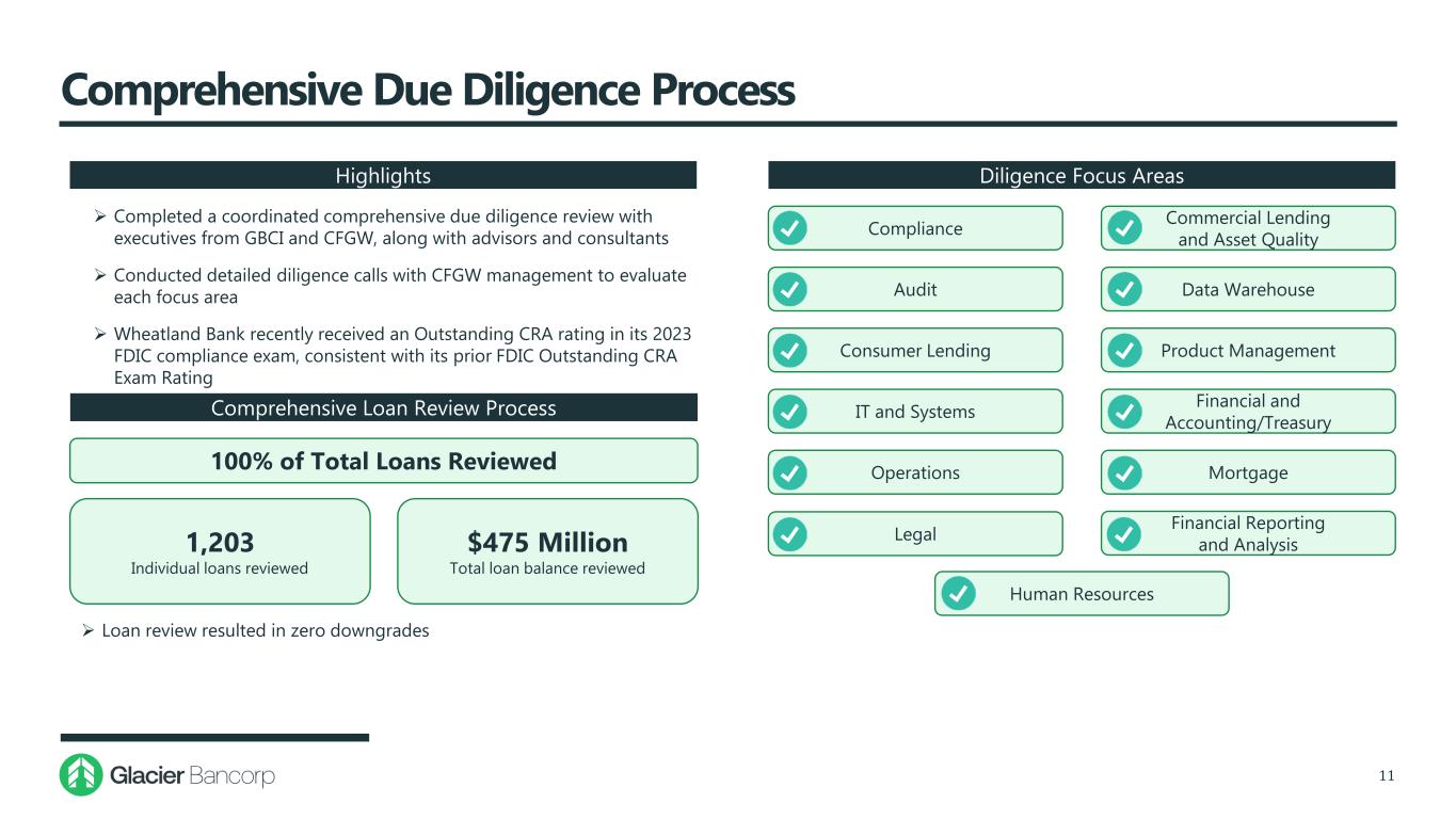 Transaction Multiples and Pro Forma Impact 10 Transaction Value / Tangible Book Value(3)  161%  140% Pay-to-Trade Ratio(4)  82%  82% Transaction Value / LTM Earnings  11.6x  10.1x Projected 2024e EPS Accretion(5) (with 50% Cost Savings Phase-In) 3.4% Projected 2025e EPS Accretion(5) (with 100% Cost Savings Phase-In) 4.2% TBV Per Share Dilution(6) 0.4% TBV Per Share Payback Period <1 Year Internal Rate of Return 15%+ Today(1) At LOI(2) Note: Multiples do not include an adjustment for an employee tax credit. (1) Based on GBCI closing price of $33.97 as of August 7, 2023. (2) Based on GBCI closing price of $29.55 as of May 24, 2023. (3) Based on required tangible book value of $49.2 million. (4) Ratio of the tangible book value multiple paid (based on required tangible common equity of $49.2 million) to GBCI’s tangible book value multiple. (5) Based on FactSet Consensus estimates for GBCI and GBCI estimates for CFGW. (6) Inclusive of all estimated restructuring charges.