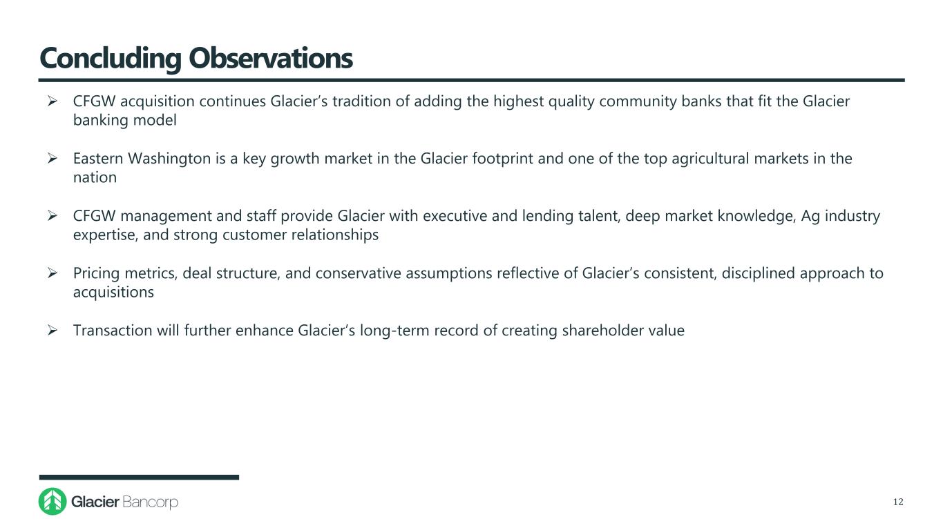 Comprehensive Due Diligence Process 11  Completed a coordinated comprehensive due diligence review with executives from GBCI and CFGW, along with advisors and consultants  Conducted detailed diligence calls with CFGW management to evaluate each focus area  Wheatland Bank recently received an Outstanding CRA rating in its 2023 FDIC compliance exam, consistent with its prior FDIC Outstanding CRA Exam Rating Comprehensive Loan Review Process 100% of Total Loans Reviewed 1,203 Individual loans reviewed $475 Million Total loan balance reviewed Diligence Focus Areas Consumer Lending IT and Systems Operations Compliance Audit Legal Commercial Lending and Asset Quality Human Resources Data Warehouse Product Management Financial and Accounting/Treasury Mortgage Financial Reporting and Analysis Highlights  Loan review resulted in zero downgrades