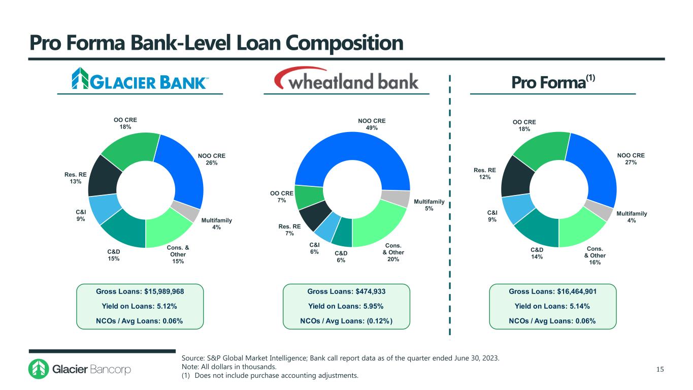 DDA 32% NOW & Other 16% MMDA & Sav. 40% Retail Time 8% Jumbo Time 4% DDA 32% NOW & Other 16% MMDA & Sav. 39% Retail Time 9% Jumbo Time 4% Cost of Deposits: 0.86% Loans / Deposits: 78.0% Total Deposits: $608,681 Cost of Deposits: 0.65% Loans / Deposits: 79.4% Total Deposits: $20,734,851Total Deposits: $20,126,170 Cost of Deposits: 0.65% Loans / Deposits: 79.4% Pro Forma Bank-Level Deposit Composition 14 Source: S&P Global Market Intelligence; Bank call report data as of the quarter ended June 30, 2023. Note: All dollars in thousands. (1) Does not include purchase accounting adjustments. DDA 45% NOW & Other 3% MMDA & Sav. 43% Retail Time 4% Jumbo Time 5% Pro Forma(1)