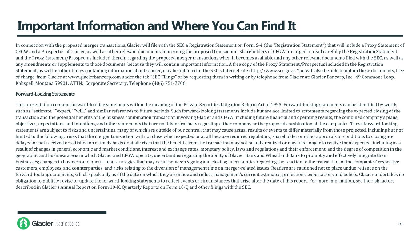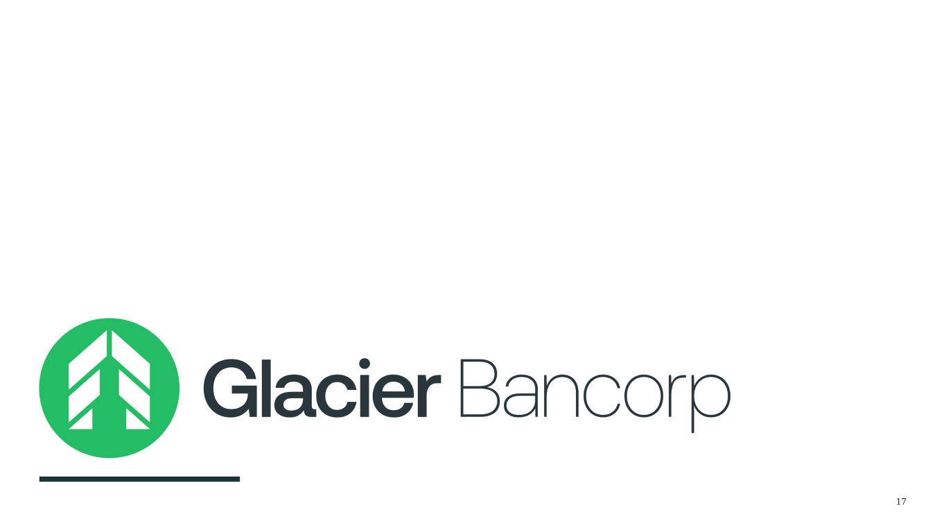 Important Information and Where You Can Find It 16 In connection with the proposed merger transactions, Glacier will file with the SEC a Registration Statement on Form S-4 (the “Registration Statement”) that will include a Proxy Statement of CFGW and a Prospectus of Glacier, as well as other relevant documents concerning the proposed transaction. Shareholders of CFGW are urged to read carefully the Registration Statement and the Proxy Statement/Prospectus included therein regarding the proposed merger transactions when it becomes available and any other relevant documents filed with the SEC, as well as any amendments or supplements to those documents, because they will contain important information. A free copy of the Proxy Statement/Prospectus included in the Registration Statement, as well as other filings containing information about Glacier, may be obtained at the SEC’s Internet site (http://www.sec.gov). You will also be able to obtain these documents, free of charge, from Glacier at www.glacierbancorp.com under the tab “SEC Filings” or by requesting them in writing or by telephone from Glacier at: Glacier Bancorp, Inc., 49 Commons Loop, Kalispell, Montana 59901, ATTN: Corporate Secretary; Telephone (406) 751-7706. Forward-Looking Statements This presentation contains forward-looking statements within the meaning of the Private Securities Litigation Reform Act of 1995. Forward-looking statements can be identified by words such as “estimate,” “expect,” “will,” and similar references to future periods. Such forward-looking statements include but are not limited to statements regarding the expected closing of the transaction and the potential benefits of the business combination transaction involving Glacier and CFGW, including future financial and operating results, the combined company’s plans, objectives, expectations and intentions, and other statements that are not historical facts regarding either company or the proposed combination of the companies. These forward-looking statements are subject to risks and uncertainties, many of which are outside of our control, that may cause actual results or events to differ materially from those projected, including but not limited to the following: risks that the merger transaction will not close when expected or at all because required regulatory, shareholder or other approvals or conditions to closing are delayed or not received or satisfied on a timely basis or at all; risks that the benefits from the transaction may not be fully realized or may take longer to realize than expected, including as a result of changes in general economic and market conditions, interest and exchange rates, monetary policy, laws and regulations and their enforcement, and the degree of competition in the geographic and business areas in which Glacier and CFGW operate; uncertainties regarding the ability of Glacier Bank and Wheatland Bank to promptly and effectively integrate their businesses; changes in business and operational strategies that may occur between signing and closing; uncertainties regarding the reaction to the transaction of the companies’ respective customers, employees, and counterparties; and risks relating to the diversion of management time on merger-related issues. Readers are cautioned not to place undue reliance on the forward-looking statements, which speak only as of the date on which they are made and reflect management’s current estimates, projections, expectations and beliefs. Glacier undertakes no obligation to publicly revise or update the forward-looking statements to reflect events or circumstances that arise after the date of this report. For more information, see the risk factors described in Glacier’s Annual Report on Form 10-K, Quarterly Reports on Form 10-Q and other filings with the SEC.
