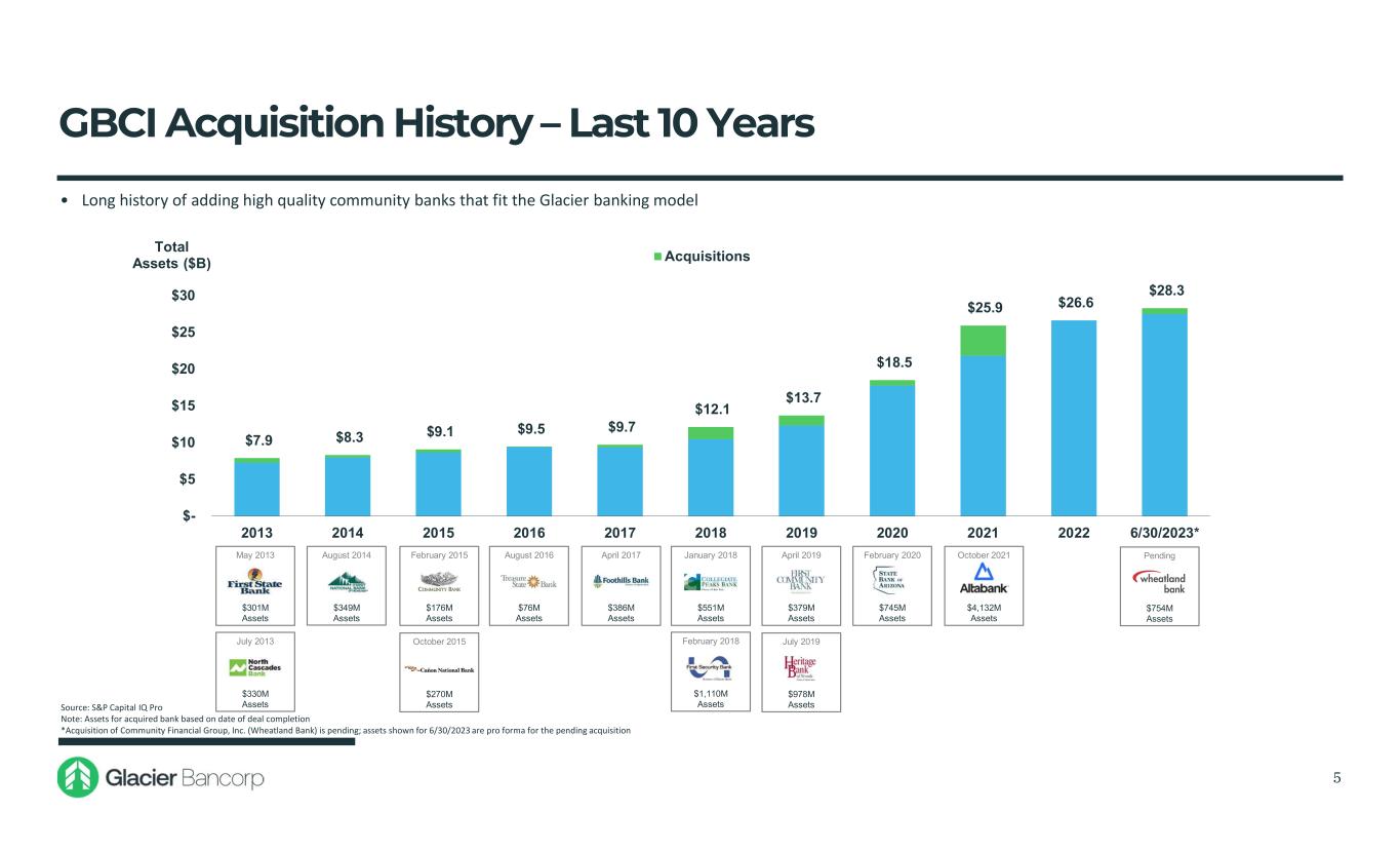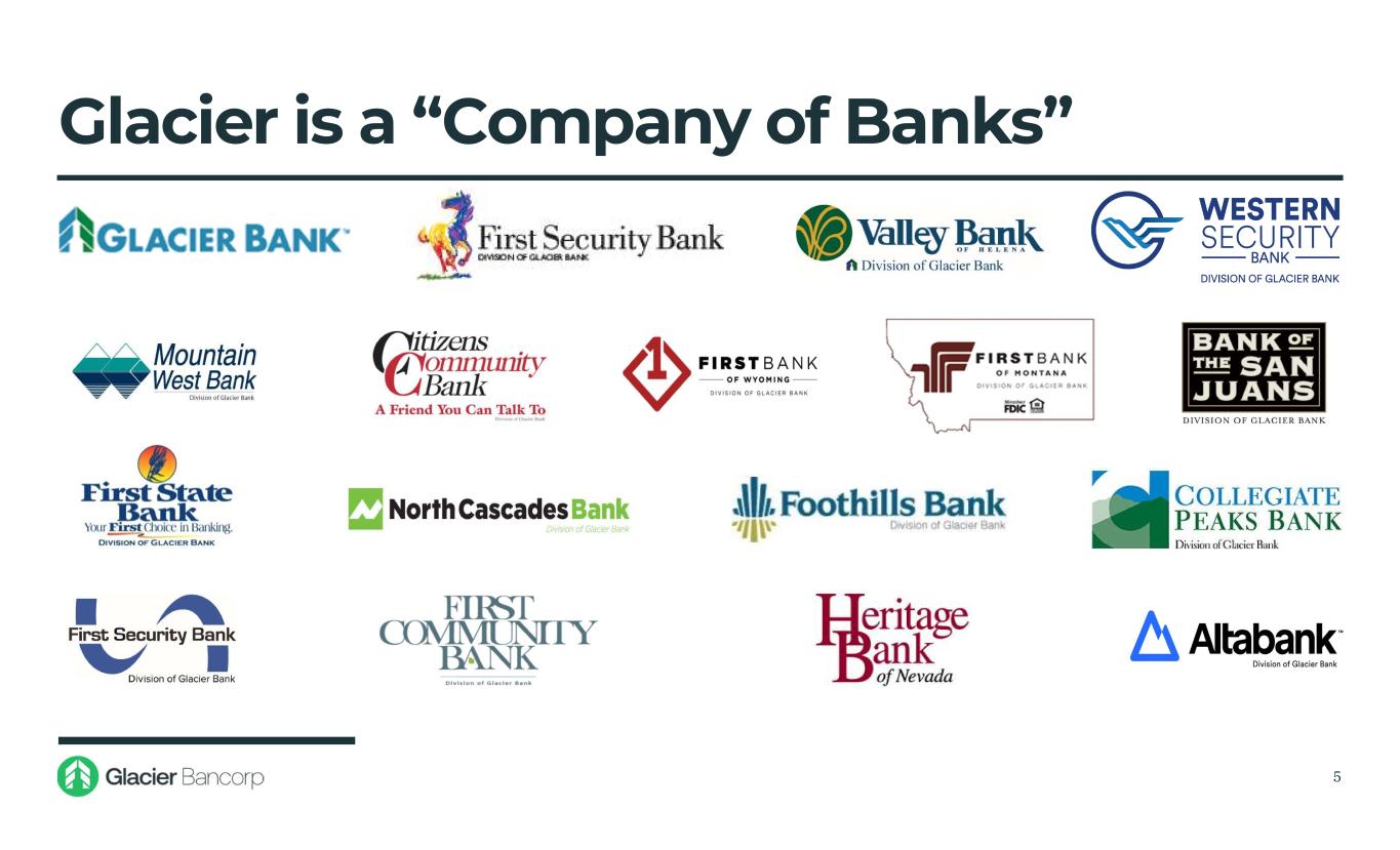 Differentiated Bank Model • Genuine community banking model • Backed by resources and support of Glacier Bancorp • Strategy of growth through acquisitions and organically 4