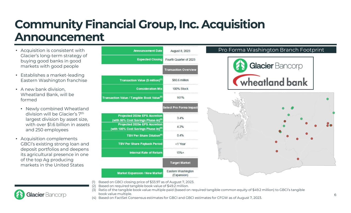 $7.9 $8.3 $9.1 $9.5 $9.7 $12.1 $13.7 $18.5 $25.9 $26.6 $28.3 $- $5 $10 $15 $20 $25 $30 2013 2014 2015 2016 2017 2018 2019 2020 2021 2022 6/30/2023* Total Assets ($B) Acquisitions GBCI Acquisition History – Last 10 Years 5 • Long history of adding high quality community banks that fit the Glacier banking model May 2013 $301M Assets July 2013 $330M Assets August 2014 $349M Assets February 2015 $176M Assets October 2015 $270M Assets October 2021 $4,132M Assets July 2019 $978M Assets April 2017 $386M Assets April 2019 $379M Assets February 2018 $1,110M Assets January 2018 $551M Assets February 2020 $745M Assets August 2016 $76M Assets Source: S&P Capital IQ Pro Note: Assets for acquired bank based on date of deal completion *Acquisition of Community Financial Group, Inc. (Wheatland Bank) is pending; assets shown for 6/30/2023 are pro forma for the pending acquisition Pending $754M Assets