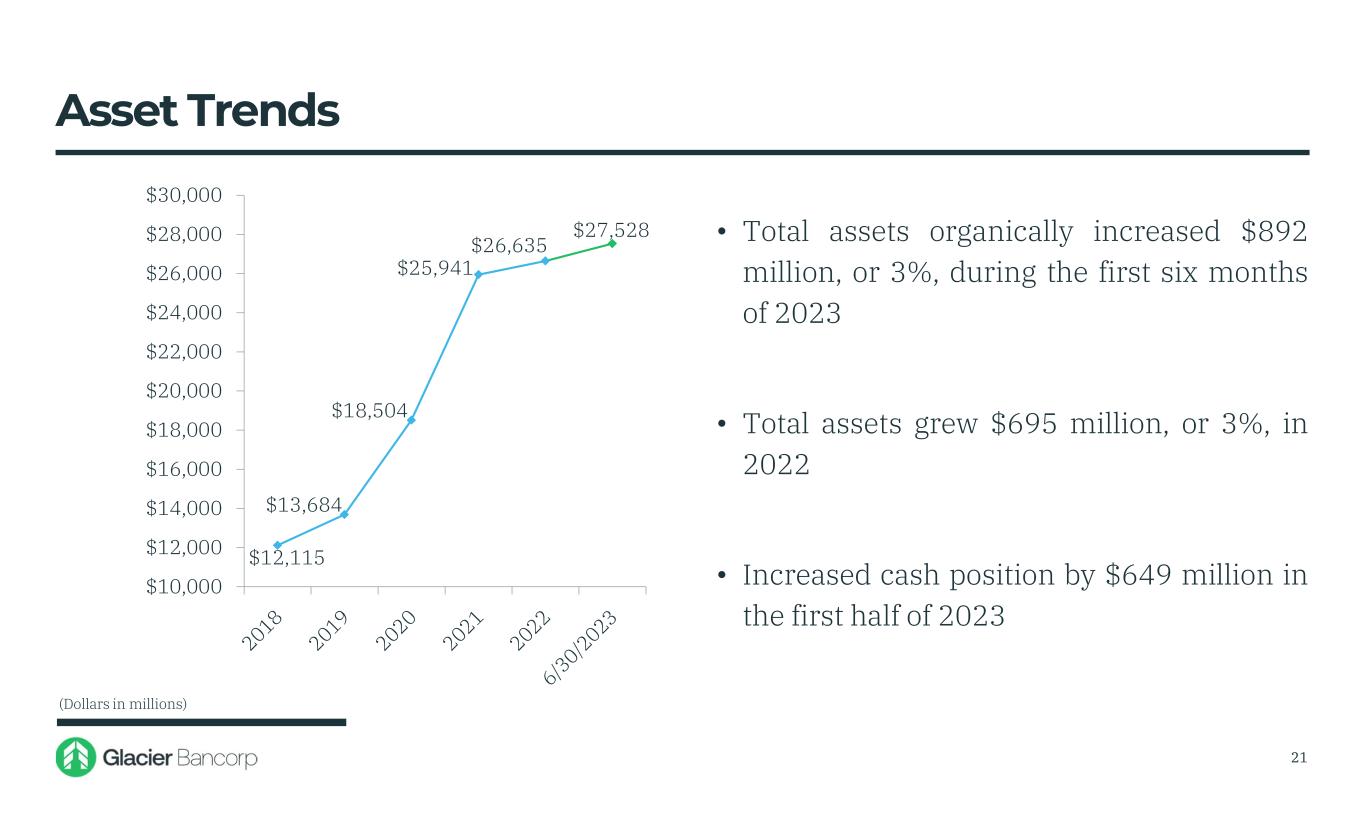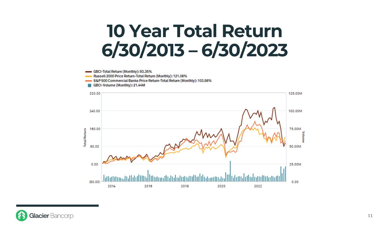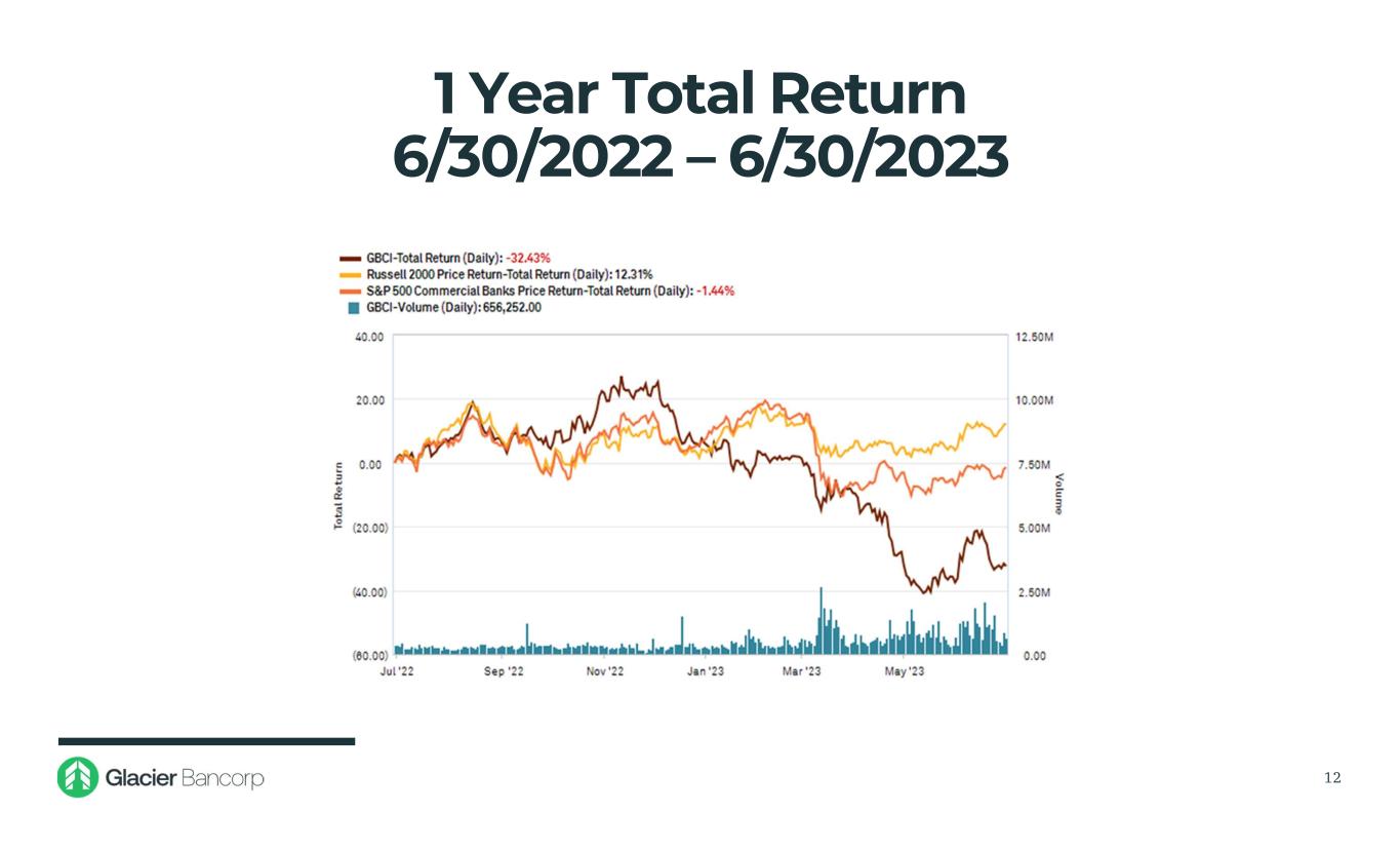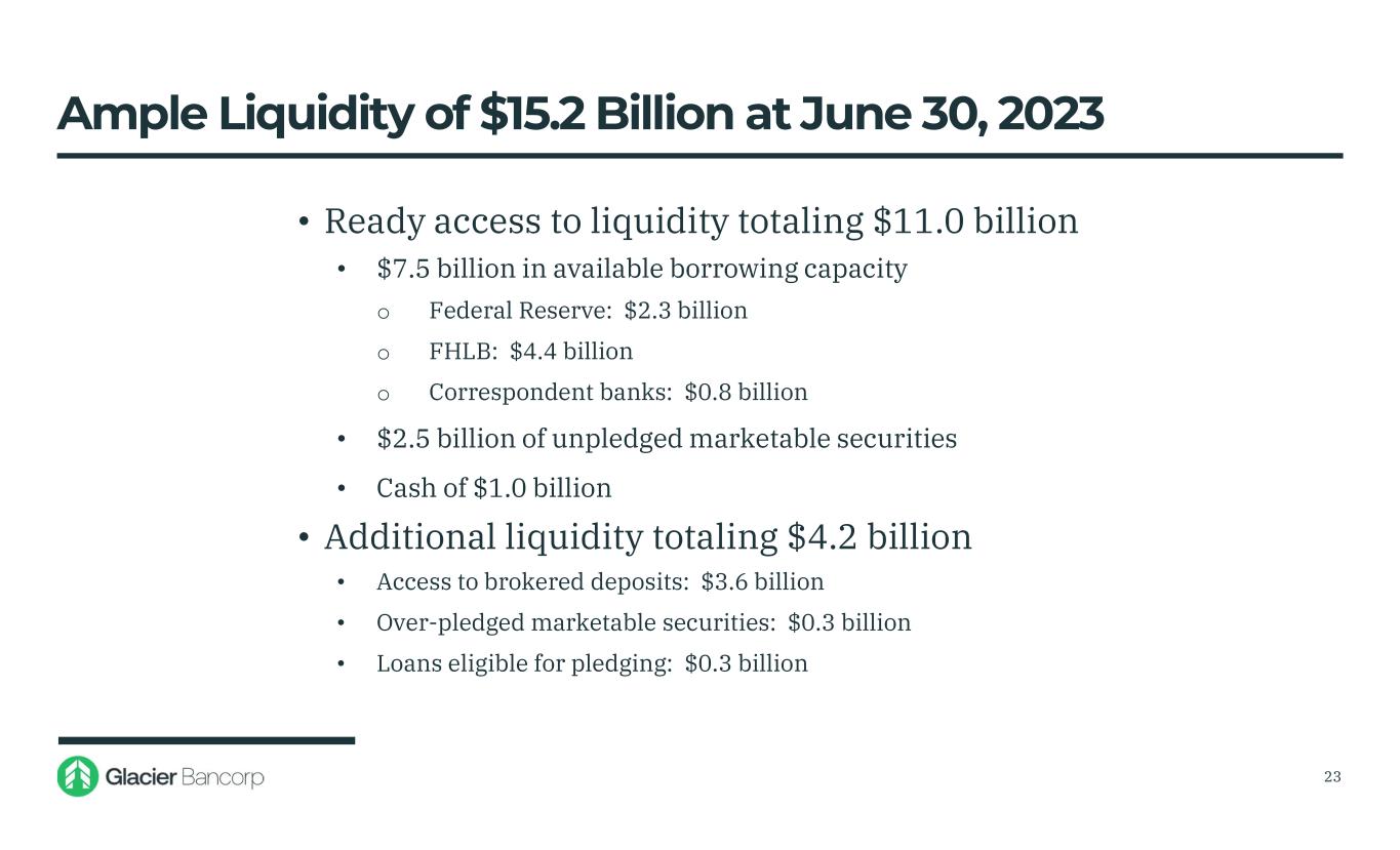 Glacier Bancorp, Inc. 6/30/2023 Snapshot Ticker GBCI Total Assets $27.53 billion Gross Loans $15.95 billion Deposits $20.01 billion TCBV Per Share $17.18 Dividends $0.33 Stock Price $31.17 Market Cap $3.46 billion 3