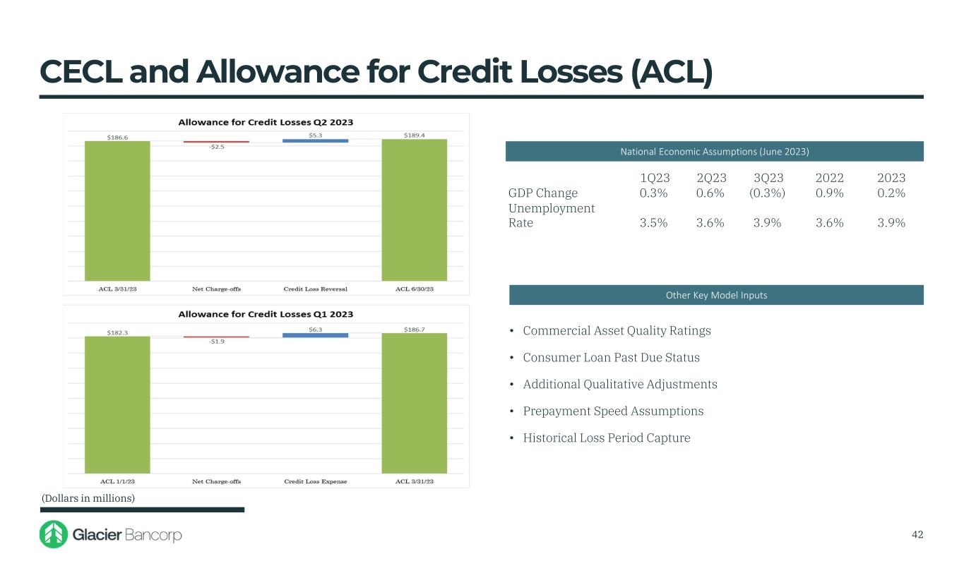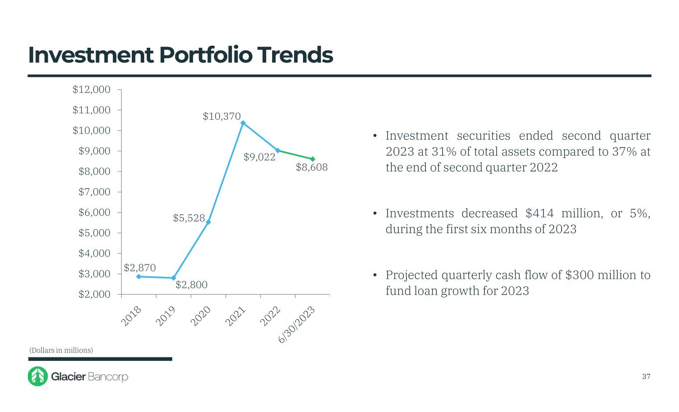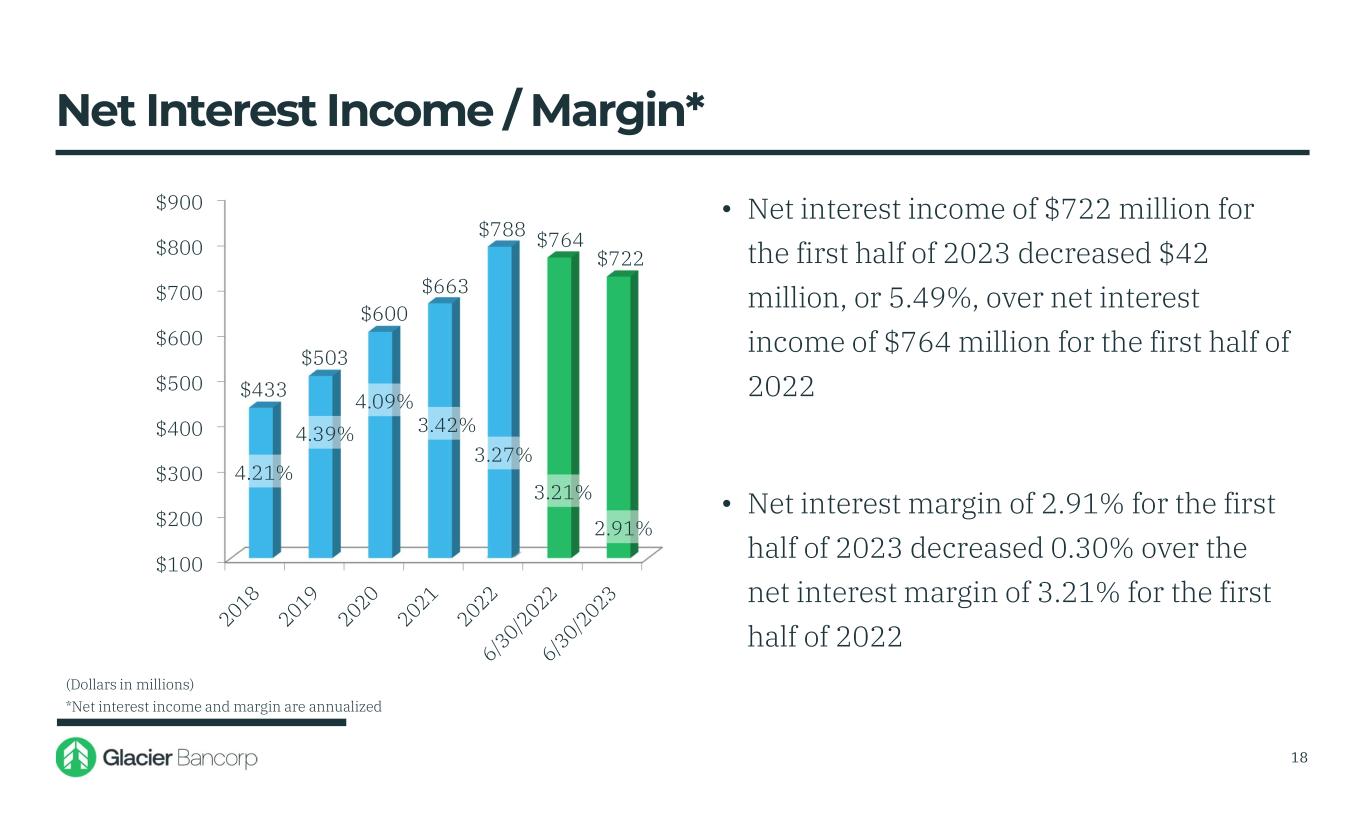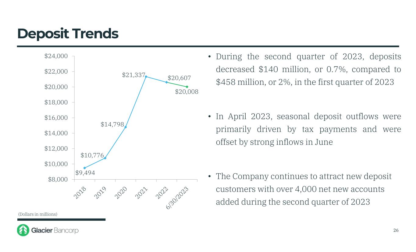 Glacier Bancorp, Inc. 6/30/2023 Snapshot Ticker GBCI Total Assets $27.53 billion Gross Loans $15.95 billion Deposits $20.01 billion TCBV Per Share $17.18 Dividends $0.33 Stock Price $31.17 Market Cap $3.46 billion 3