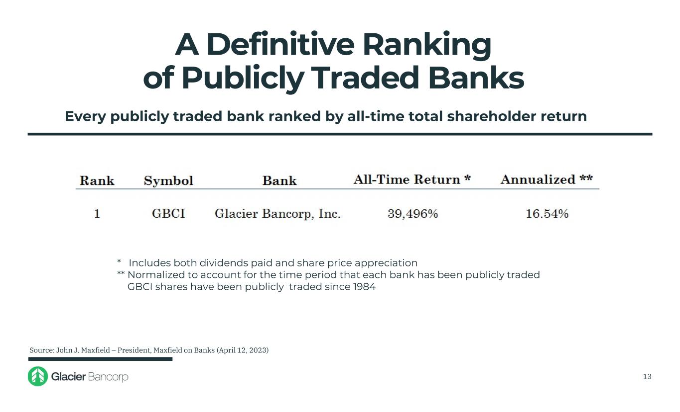 A Definitive Ranking of Publicly Traded Banks 13 Every publicly traded bank ranked by all-time total shareholder return * Includes both dividends paid and share price appreciation ** Normalized to account for the time period that each bank has been publicly traded GBCI shares have been publicly traded since 1984 Source: John J. Maxfield – President, Maxfield on Banks (April 12, 2023)
