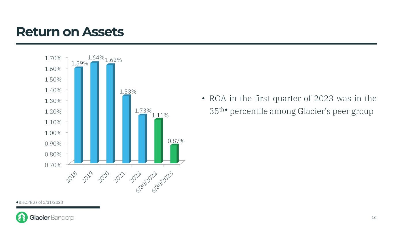 15 Diluted Earnings Per Share $0.00 $0.25 $0.50 $0.75 $1.00 $1.25 $1.50 $1.75 $2.00 $2.25 $2.50 $2.75 $3.00 $3.25 $2.17 $2.38 $2.74 $0.61 $0.55 $0.69 $0.50 $2.86 • The decrease in second quarter 2023 EPS over second quarter 2022 EPS was driven primarily by the significant increase in funding costs from the historic pace of the Federal Reserve’s interest rate increases • Second quarter 2023 non-interest expense of $131 million increased $1.1 million, or 1%, over the $130 million for second quarter 2022 $2.81 $1.30 $1.05