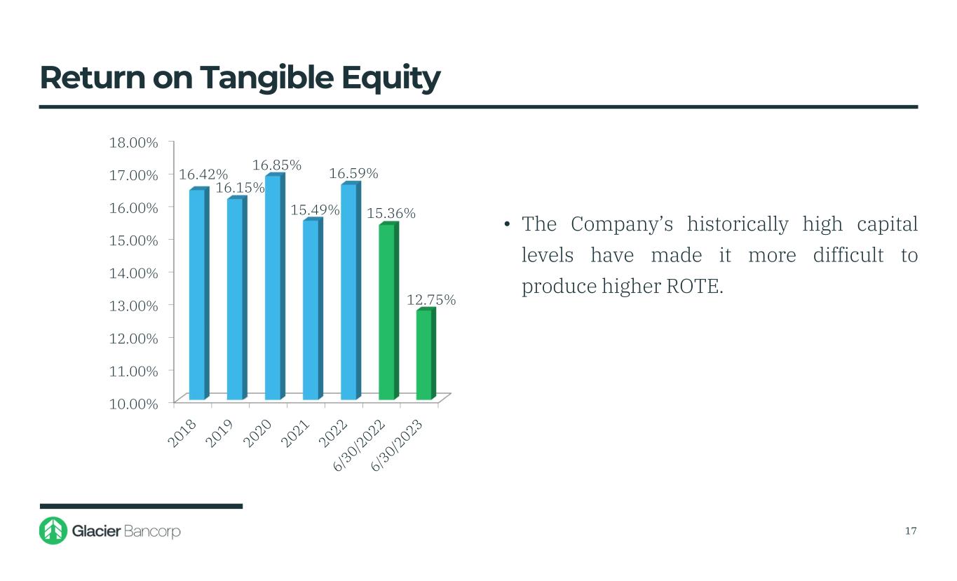 0.70% 0.80% 0.90% 1.00% 1.10% 1.20% 1.30% 1.40% 1.50% 1.60% 1.70% 1.64% 1.59% 1.62% 1.73% 1.11% 0.87% • ROA in the first quarter of 2023 was in the 35th♦ percentile among Glacier’s peer group 16 Return on Assets ♦BHCPR as of 3/31/2023 1.33%