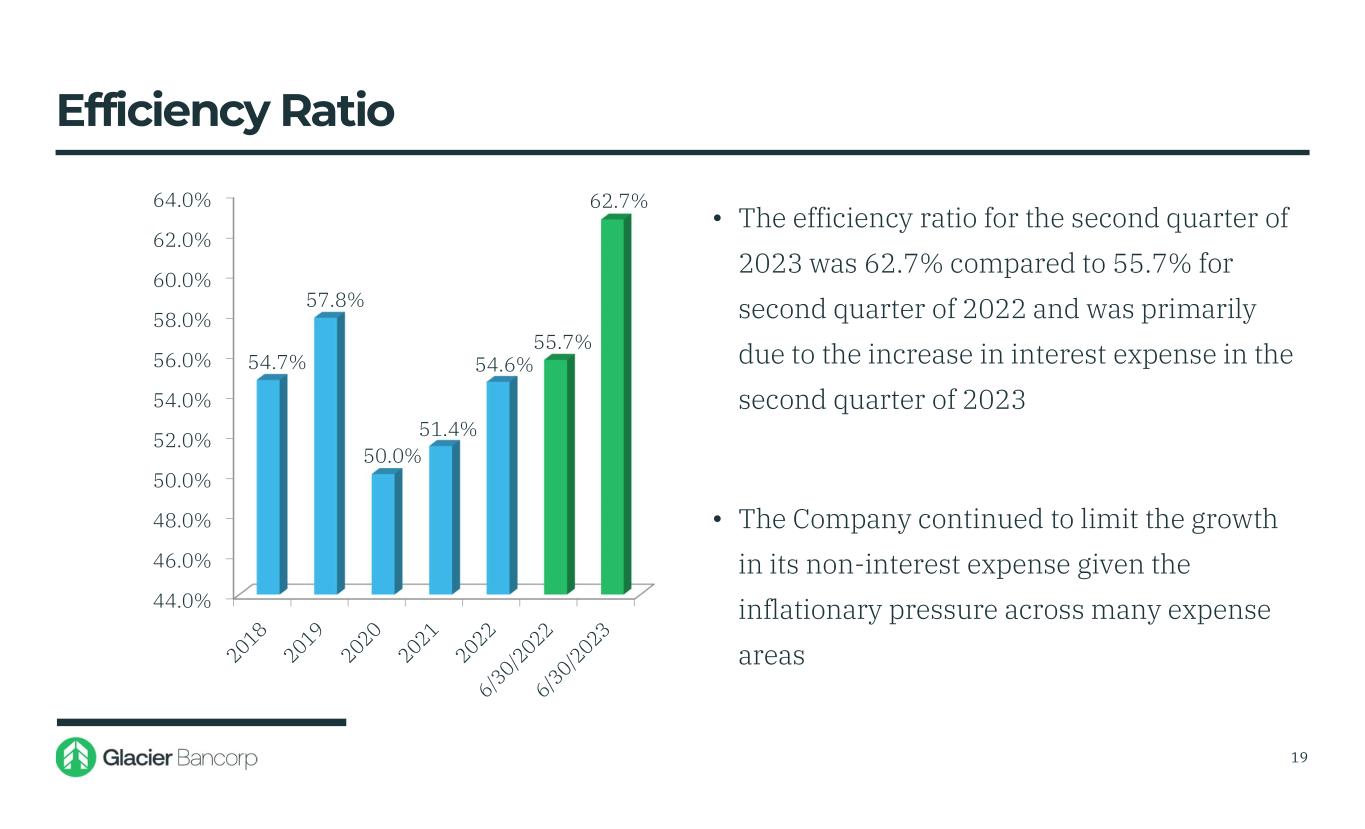 $100 $200 $300 $400 $500 $600 $700 $800 $900 $433 $503 $600 $663 $788 $764 $722 4.21% 4.39% 4.09% 3.42% 3.27% 3.21% 2.91% • Net interest income of $722 million for the first half of 2023 decreased $42 million, or 5.49%, over net interest income of $764 million for the first half of 2022 • Net interest margin of 2.91% for the first half of 2023 decreased 0.30% over the net interest margin of 3.21% for the first half of 2022 18 Net Interest Income / Margin* (Dollars in millions) *Net interest income and margin are annualized