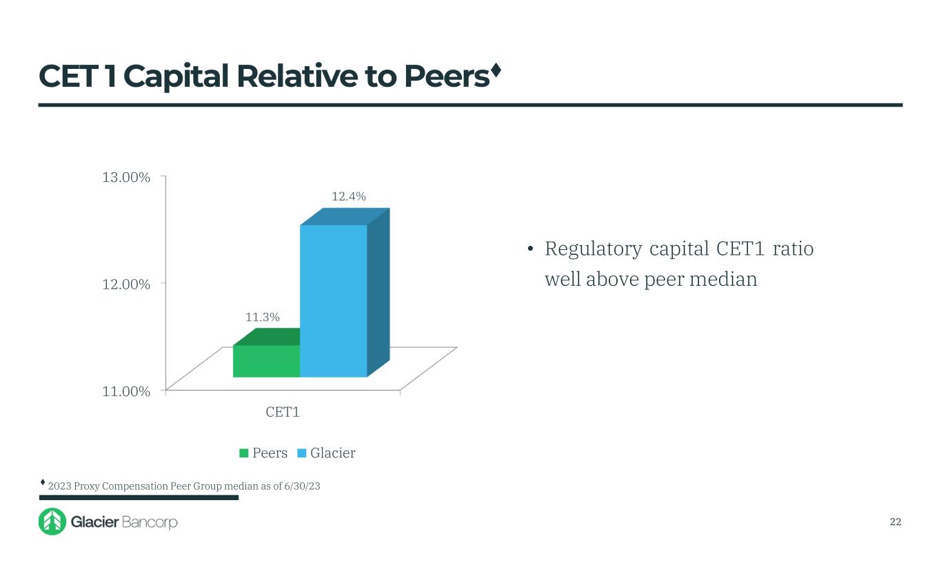 11.00% 12.00% 13.00% CET1 11.3% 12.4% Peers Glacier • Regulatory capital CET1 ratio well above peer median 22 CET 1 Capital Relative to Peers♦ ♦ 2023 Proxy Compensation Peer Group median as of 6/30/23