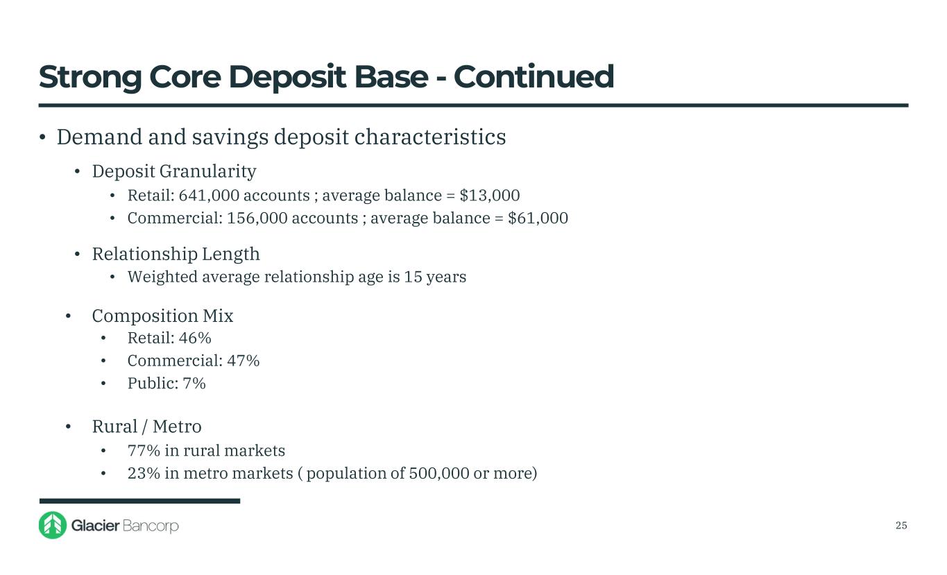 Strong Core Deposit Base • Our community banking model is customer relationship driven • Uninsured deposits, excluding collateralized public deposits and cash held at the holding company, are 23% of total deposits • 31% of uninsured deposits are with customers that also have a loan relationship with us • Deposit accounts less than $250,000 have increased 1% year to date • Non-interest bearing deposits • 54% of non-interest bearing balances are in accounts with $250,000 or less • 49% of non-interest bearing deposits are with customers with multiple accounts • 81% of non-interest bearing balances are in business accounts 24