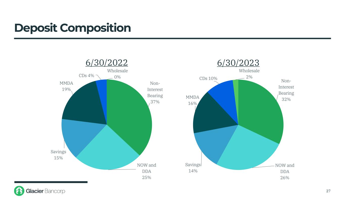 $9,494 $10,776 $14,798 $21,337 $20,607 $20,008 $8,000 $10,000 $12,000 $14,000 $16,000 $18,000 $20,000 $22,000 $24,000 • During the second quarter of 2023, deposits decreased $140 million, or 0.7%, compared to $458 million, or 2%, in the first quarter of 2023 • In April 2023, seasonal deposit outflows were primarily driven by tax payments and were offset by strong inflows in June • The Company continues to attract new deposit customers with over 4,000 net new accounts added during the second quarter of 2023 26 Deposit Trends (Dollars in millions)
