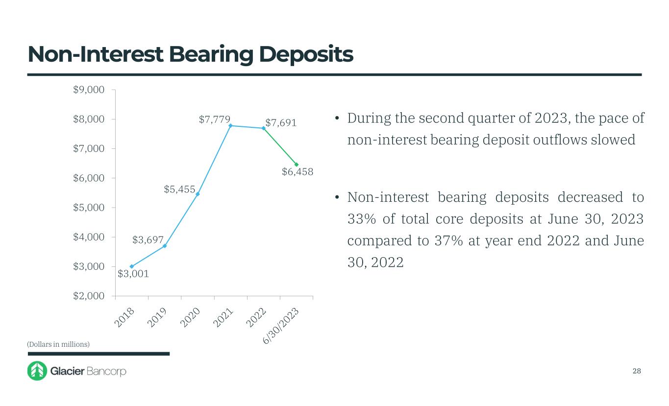 Non- Interest Bearing 37% NOW and DDA 25% Savings 15% MMDA 19% CDs 4% Wholesale 0% 6/30/2022 Non- Interest Bearing 32% NOW and DDA 26% Savings 14% MMDA 16% CDs 10% Wholesale 2% 6/30/2023 27 Deposit Composition