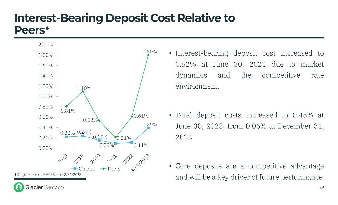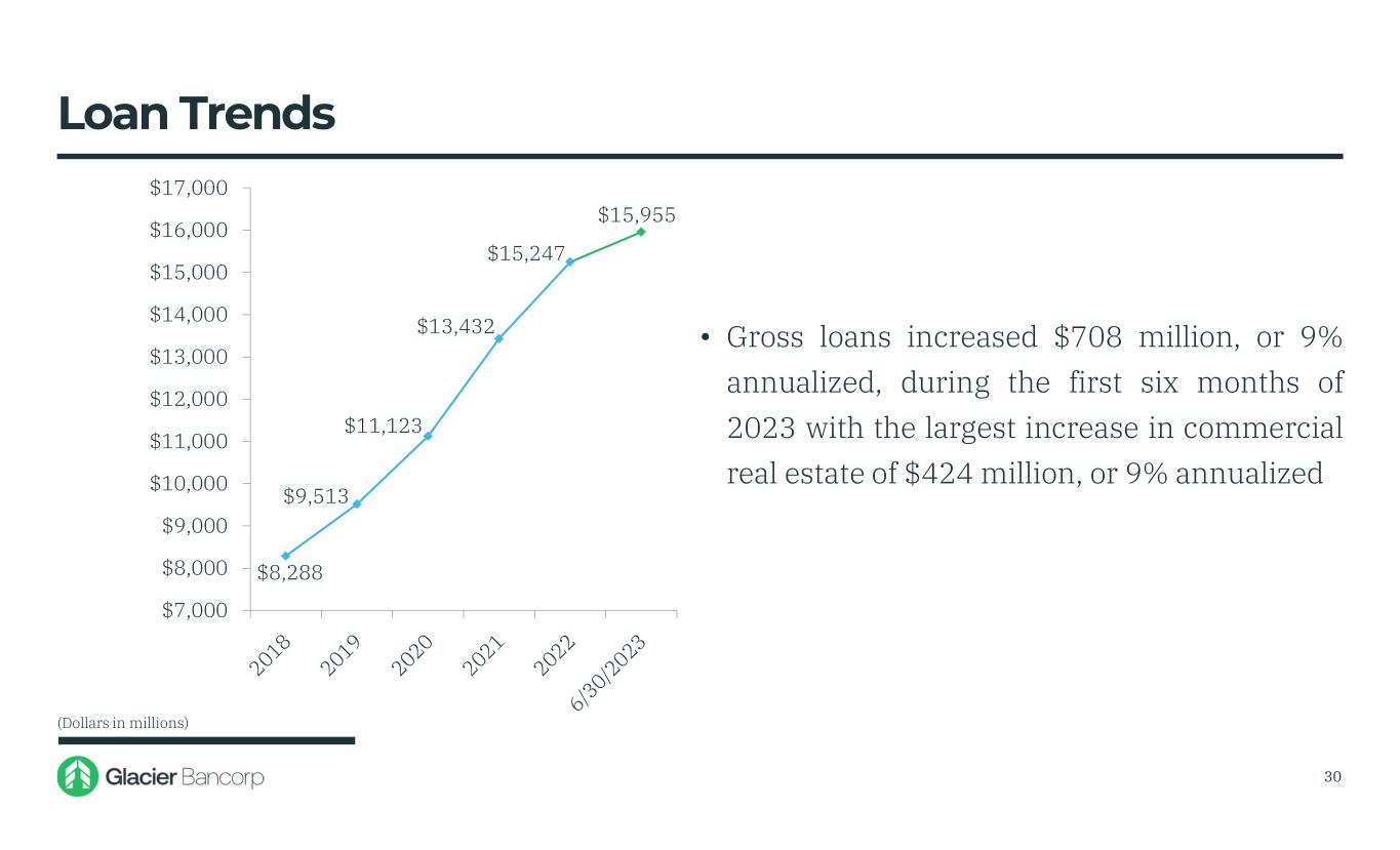 0.22% 0.24% 0.15% 0.09% 0.11% 0.39% 0.81% 1.10% 0.53% 0.21% 0.61% 1.80% 0.00% 0.20% 0.40% 0.60% 0.80% 1.00% 1.20% 1.40% 1.60% 1.80% 2.00% Glacier Peers • Interest-bearing deposit cost increased to 0.62% at June 30, 2023 due to market dynamics and the competitive rate environment. • Total deposit costs increased to 0.45% at June 30, 2023, from 0.06% at December 31, 2022 • Core deposits are a competitive advantage and will be a key driver of future performance 29 Interest-Bearing Deposit Cost Relative to Peers♦ ♦Graph based on BHCPR as of 3/31/2023