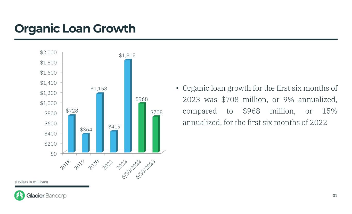 $8,288 $9,513 $11,123 $13,432 $15,247 $15,955 $7,000 $8,000 $9,000 $10,000 $11,000 $12,000 $13,000 $14,000 $15,000 $16,000 $17,000 • Gross loans increased $708 million, or 9% annualized, during the first six months of 2023 with the largest increase in commercial real estate of $424 million, or 9% annualized 30 Loan Trends (Dollars in millions)