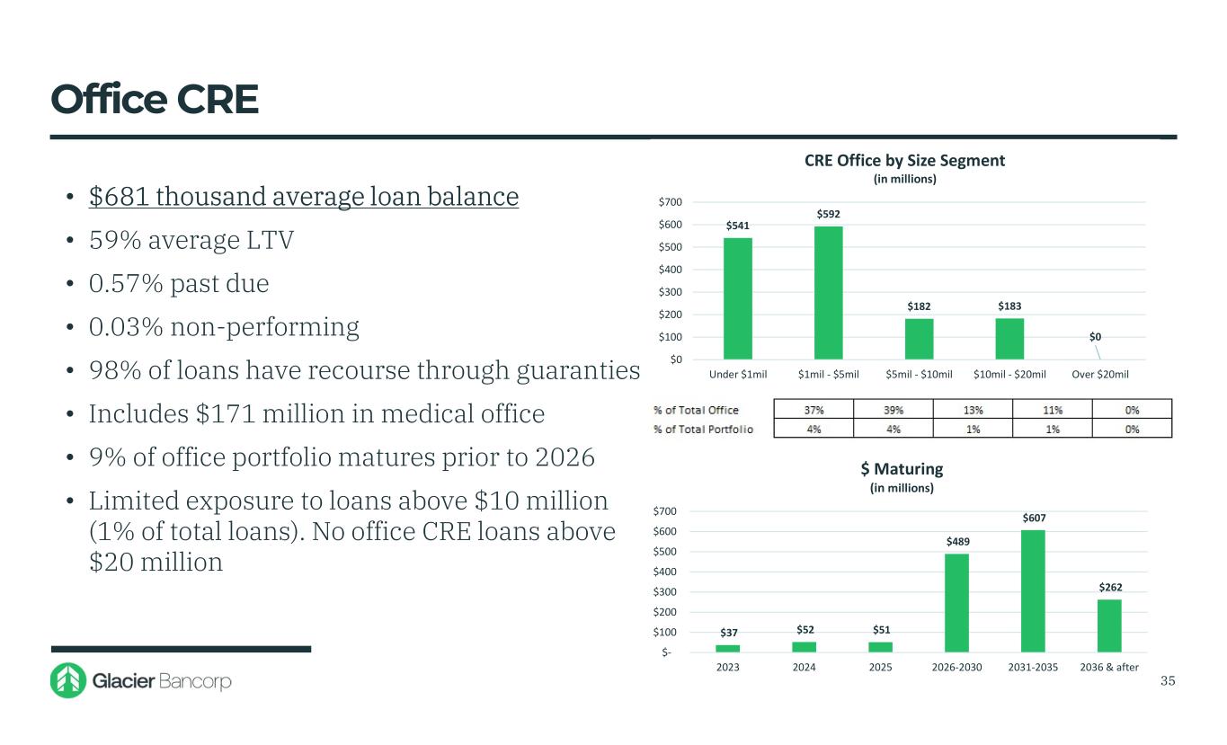Term CRE Portfolio Diversified and Low Risk Portfolio • Total portfolio $6.6 billion (42% of total portfolio) • Non-owner portfolio $3.7 billion (23% of total portfolio) • $850 thousand average loan balance • 59% average LTV • 0.15% past due rate • 0.10% non-performing • $189 million non-recourse (2% of CRE) • Geographically dispersed across 8 states UT 19% ID 11% MT 24%WY 6% NV 9% CO 11% WA 6% AZ 14% CRE GEOGRAPHIC DISPERSION 34 45% 55% TOTAL CRE BY OCCUPANCY TYPE Owner Occupied Non-Owner Occupied