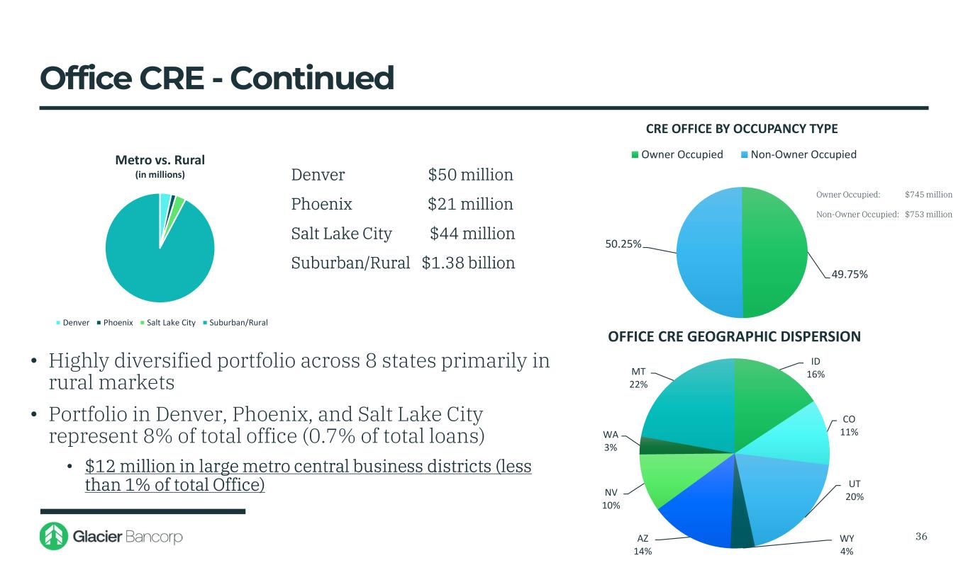 Office CRE • $681 thousand average loan balance • 59% average LTV • 0.57% past due • 0.03% non-performing • 98% of loans have recourse through guaranties • Includes $171 million in medical office • 9% of office portfolio matures prior to 2026 • Limited exposure to loans above $10 million (1% of total loans). No office CRE loans above $20 million 35 $541 $592 $182 $183 $0 $0 $100 $200 $300 $400 $500 $600 $700 Under $1mil $1mil - $5mil $5mil - $10mil $10mil - $20mil Over $20mil CRE Office by Size Segment (in millions) $37 $52 $51 $489 $607 $262 $- $100 $200 $300 $400 $500 $600 $700 2023 2024 2025 2026-2030 2031-2035 2036 & after $ Maturing (in millions)