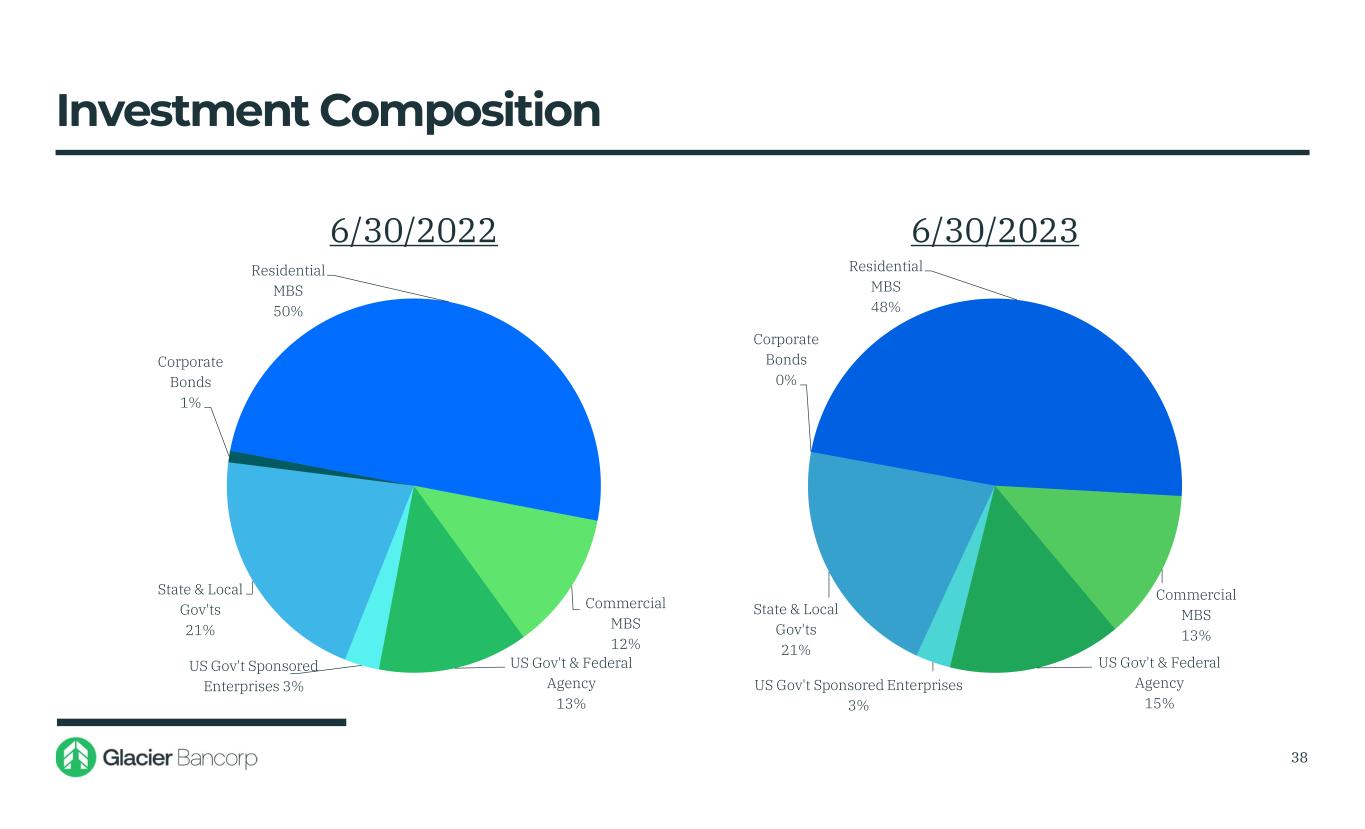$2,870 $2,800 $5,528 $10,370 $9,022 $8,608 $2,000 $3,000 $4,000 $5,000 $6,000 $7,000 $8,000 $9,000 $10,000 $11,000 $12,000 • Investment securities ended second quarter 2023 at 31% of total assets compared to 37% at the end of second quarter 2022 • Investments decreased $414 million, or 5%, during the first six months of 2023 • Projected quarterly cash flow of $300 million to fund loan growth for 2023 37 Investment Portfolio Trends (Dollars in millions)