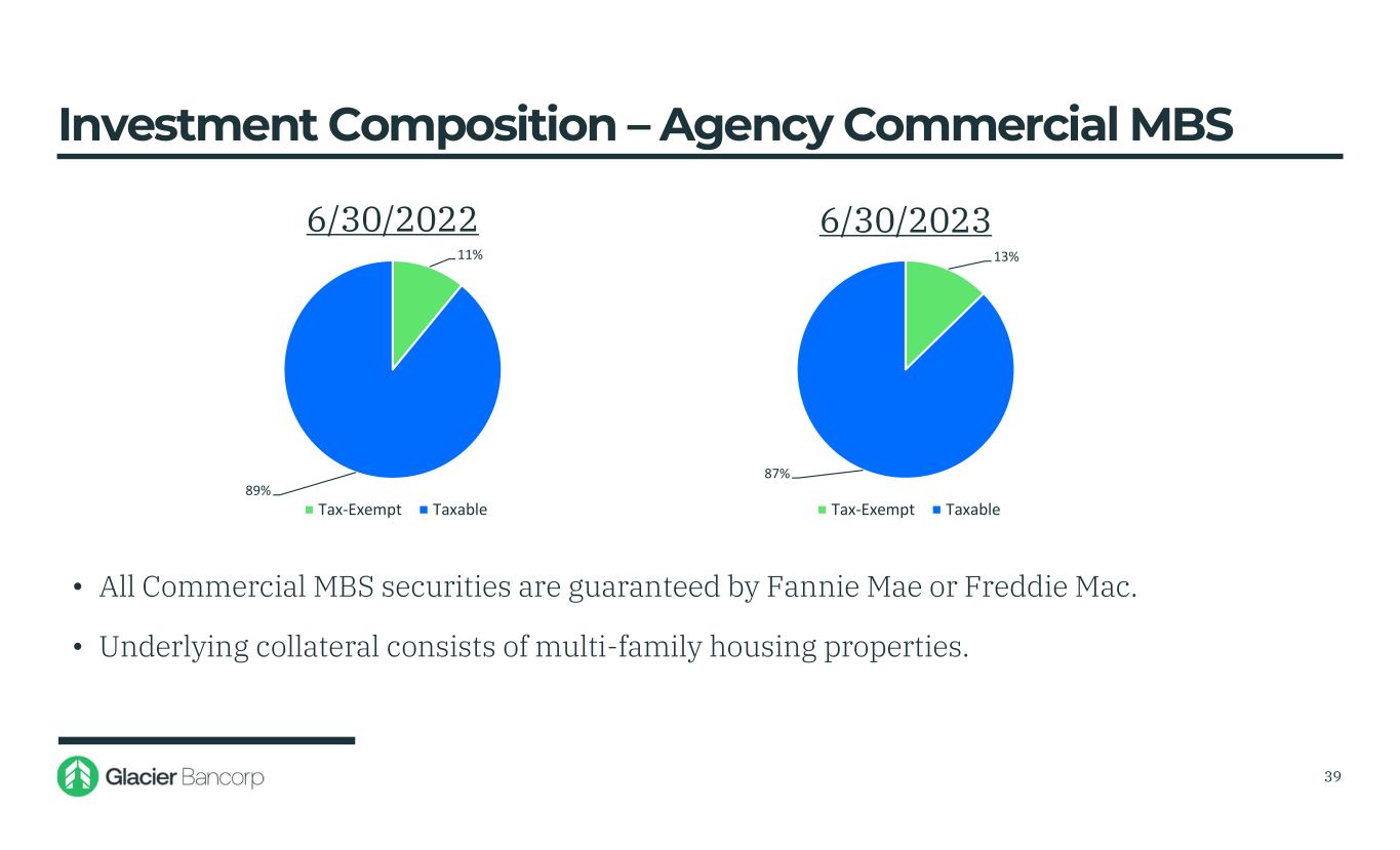 US Gov't & Federal Agency 13% US Gov't Sponsored Enterprises 3% State & Local Gov'ts 21% Corporate Bonds 1% Residential MBS 50% Commercial MBS 12% 6/30/2022 US Gov't & Federal Agency 15% US Gov't Sponsored Enterprises 3% State & Local Gov'ts 21% Corporate Bonds 0% Residential MBS 48% Commercial MBS 13% 6/30/2023 38 Investment Composition