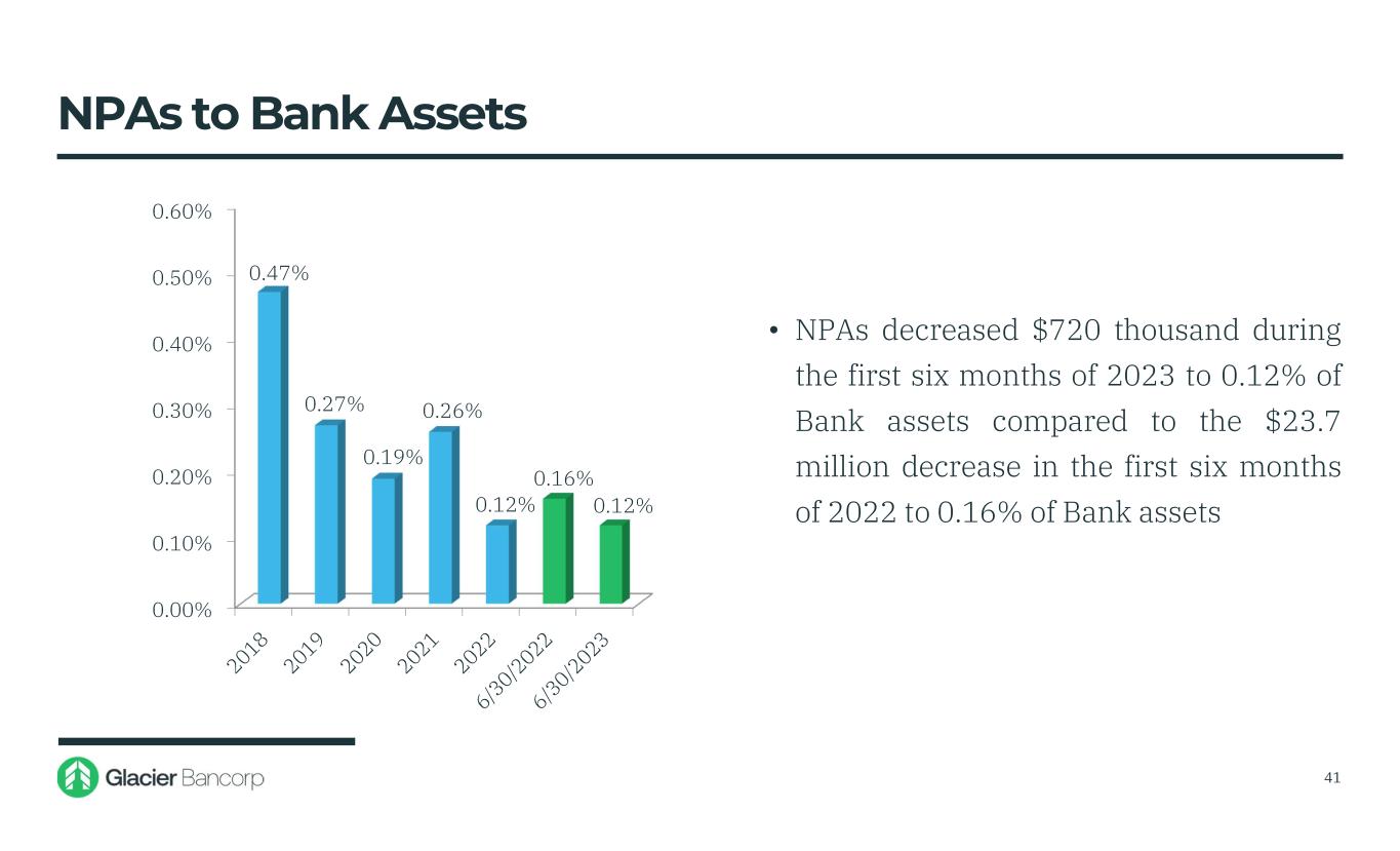 0.00% 0.10% 0.20% 0.30% 0.40% 0.50% 0.60% 0.47% 0.27% 0.26% 0.12% 0.16% 0.12% • NPAs decreased $720 thousand during the first six months of 2023 to 0.12% of Bank assets compared to the $23.7 million decrease in the first six months of 2022 to 0.16% of Bank assets 41 NPAs to Bank Assets 0.19%