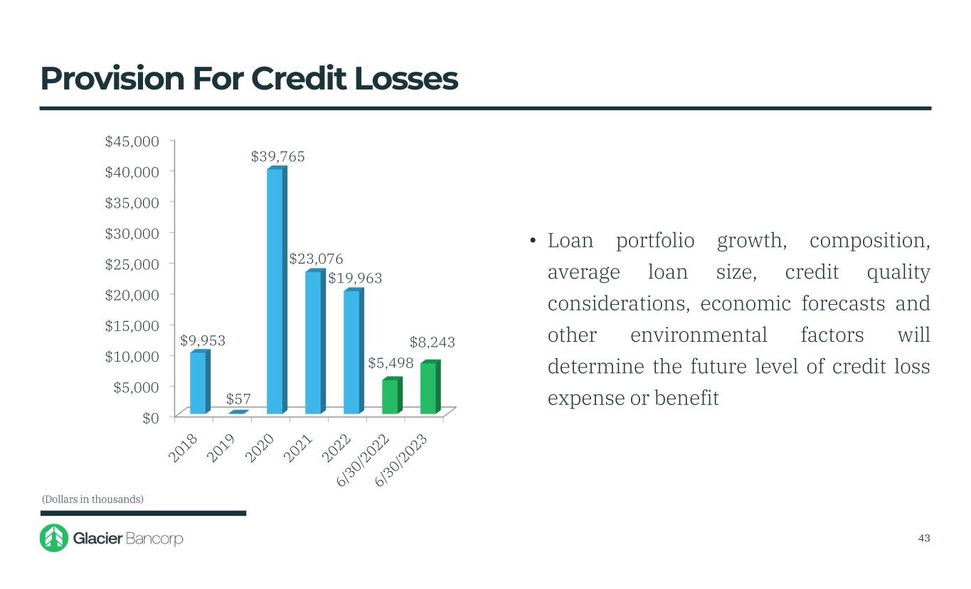 CECL and Allowance for Credit Losses (ACL) • Commercial Asset Quality Ratings • Consumer Loan Past Due Status • Additional Qualitative Adjustments • Prepayment Speed Assumptions • Historical Loss Period Capture 42 (Dollars in millions) Other Key Model Inputs National Economic Assumptions (June 2023) 1Q23 2Q23 3Q23 2022 2023 GDP Change 0.3% 0.6% (0.3%) 0.9% 0.2% Unemployment Rate 3.5% 3.6% 3.9% 3.6% 3.9%