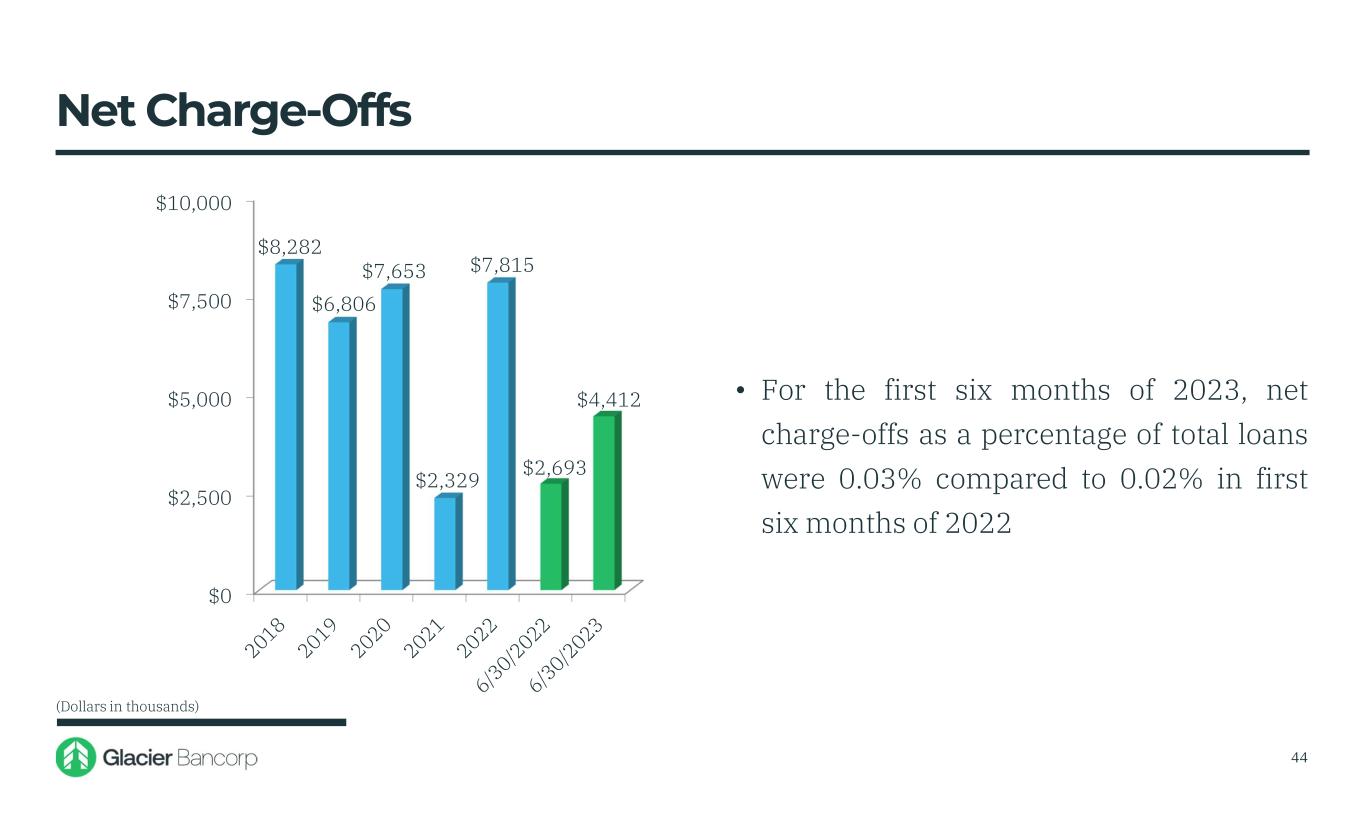 $0 $5,000 $10,000 $15,000 $20,000 $25,000 $30,000 $35,000 $40,000 $45,000 $9,953 $57 $39,765 $23,076 $19,963 $5,498 $8,243 • Loan portfolio growth, composition, average loan size, credit quality considerations, economic forecasts and other environmental factors will determine the future level of credit loss expense or benefit 43 Provision For Credit Losses (Dollars in thousands)