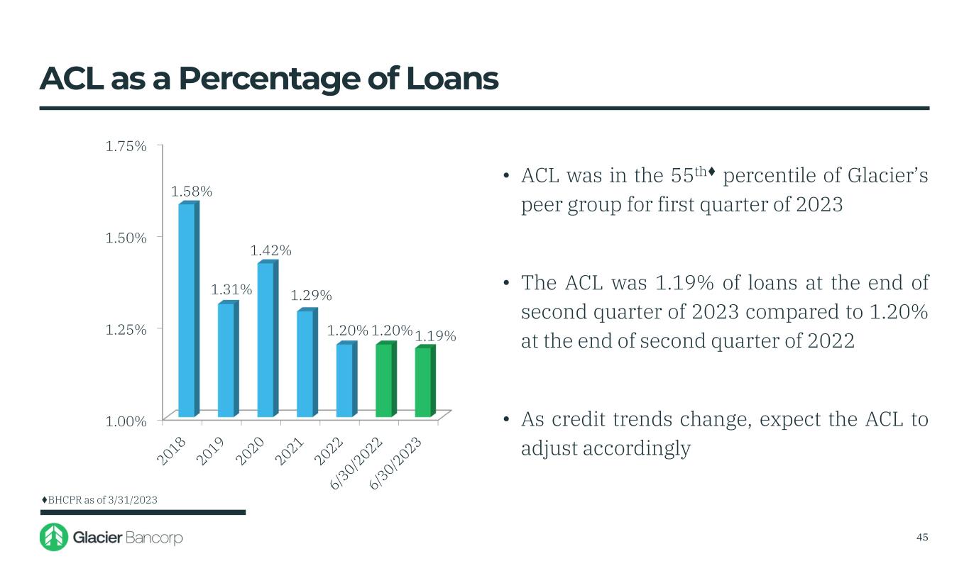 1.00% 1.25% 1.50% 1.75% 1.58% 1.31% 1.42% 1.29% 1.20% 1.20%1.19% • ACL was in the 55th♦ percentile of Glacier’s peer group for first quarter of 2023 • The ACL was 1.19% of loans at the end of second quarter of 2023 compared to 1.20% at the end of second quarter of 2022 • As credit trends change, expect the ACL to adjust accordingly 45 ACL as a Percentage of Loans ♦BHCPR as of 3/31/2023