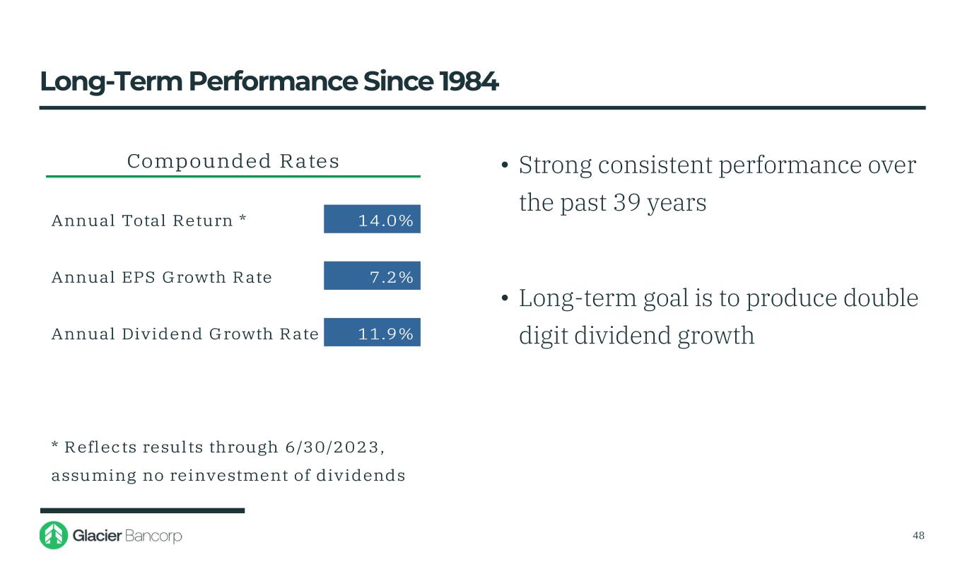 $0.50 $0.55 $0.60 $0.65 $0.70 $0.75 $0.80 $0.85 $0.90 $0.95 $1.00 $1.05 $1.10 $1.15 $1.20 $1.25 $1.30 $1.35 • At June 30, 2023, Glacier’s dividend yield was 4.23% • The Company has declared 153 consecutive quarterly dividends • In 2022, the Company increased its quarterly dividend by $0.05, or 3.9%, over 2021 47 Dividends Declared
