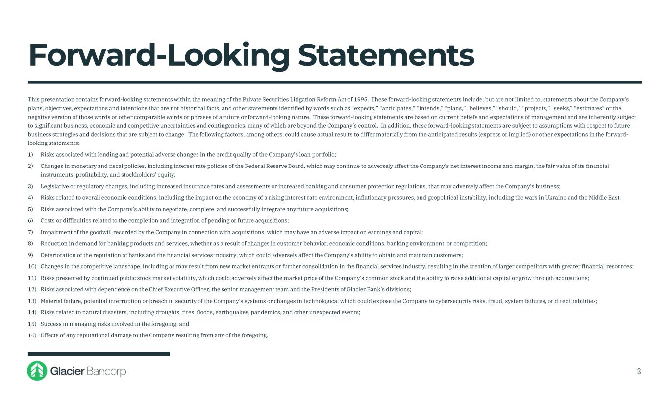 Forward-Looking Statements This presentation contains forward-looking statements within the meaning of the Private Securities Litigation Reform Act of 1995. These forward-looking statements include, but are not limited to, statements about the Company’s plans, objectives, expectations and intentions that are not historical facts, and other statements identified by words such as “expects,” “anticipates,” “intends,” “plans,” “believes,” “should,” “projects,” “seeks,” “estimates” or the negative version of those words or other comparable words or phrases of a future or forward-looking nature. These forward-looking statements are based on current beliefs and expectations of management and are inherently subject to significant business, economic and competitive uncertainties and contingencies, many of which are beyond the Company’s control. In addition, these forward-looking statements are subject to assumptions with respect to future business strategies and decisions that are subject to change. The following factors, among others, could cause actual results to differ materially from the anticipated results (express or implied) or other expectations in the forward- looking statements: 1) Risks associated with lending and potential adverse changes in the credit quality of the Company’s loan portfolio; 2) Changes in monetary and fiscal policies, including interest rate policies of the Federal Reserve Board, which may continue to adversely affect the Company’s net interest income and margin, the fair value of its financial instruments, profitability, and stockholders’ equity; 3) Legislative or regulatory changes, including increased insurance rates and assessments or increased banking and consumer protection regulations, that may adversely affect the Company’s business; 4) Risks related to overall economic conditions, including the impact on the economy of a rising interest rate environment, inflationary pressures, and geopolitical instability, including the wars in Ukraine and the Middle East; 5) Risks associated with the Company’s ability to negotiate, complete, and successfully integrate any future acquisitions; 6) Costs or difficulties related to the completion and integration of pending or future acquisitions; 7) Impairment of the goodwill recorded by the Company in connection with acquisitions, which may have an adverse impact on earnings and capital; 8) Reduction in demand for banking products and services, whether as a result of changes in customer behavior, economic conditions, banking environment, or competition; 9) Deterioration of the reputation of banks and the financial services industry, which could adversely affect the Company's ability to obtain and maintain customers; 10) Changes in the competitive landscape, including as may result from new market entrants or further consolidation in the financial services industry, resulting in the creation of larger competitors with greater financial resources; 11) Risks presented by continued public stock market volatility, which could adversely affect the market price of the Company’s common stock and the ability to raise additional capital or grow through acquisitions; 12) Risks associated with dependence on the Chief Executive Officer, the senior management team and the Presidents of Glacier Bank’s divisions; 13) Material failure, potential interruption or breach in security of the Company’s systems or changes in technological which could expose the Company to cybersecurity risks, fraud, system failures, or direct liabilities; 14) Risks related to natural disasters, including droughts, fires, floods, earthquakes, pandemics, and other unexpected events; 15) Success in managing risks involved in the foregoing; and 16) Effects of any reputational damage to the Company resulting from any of the foregoing. 2