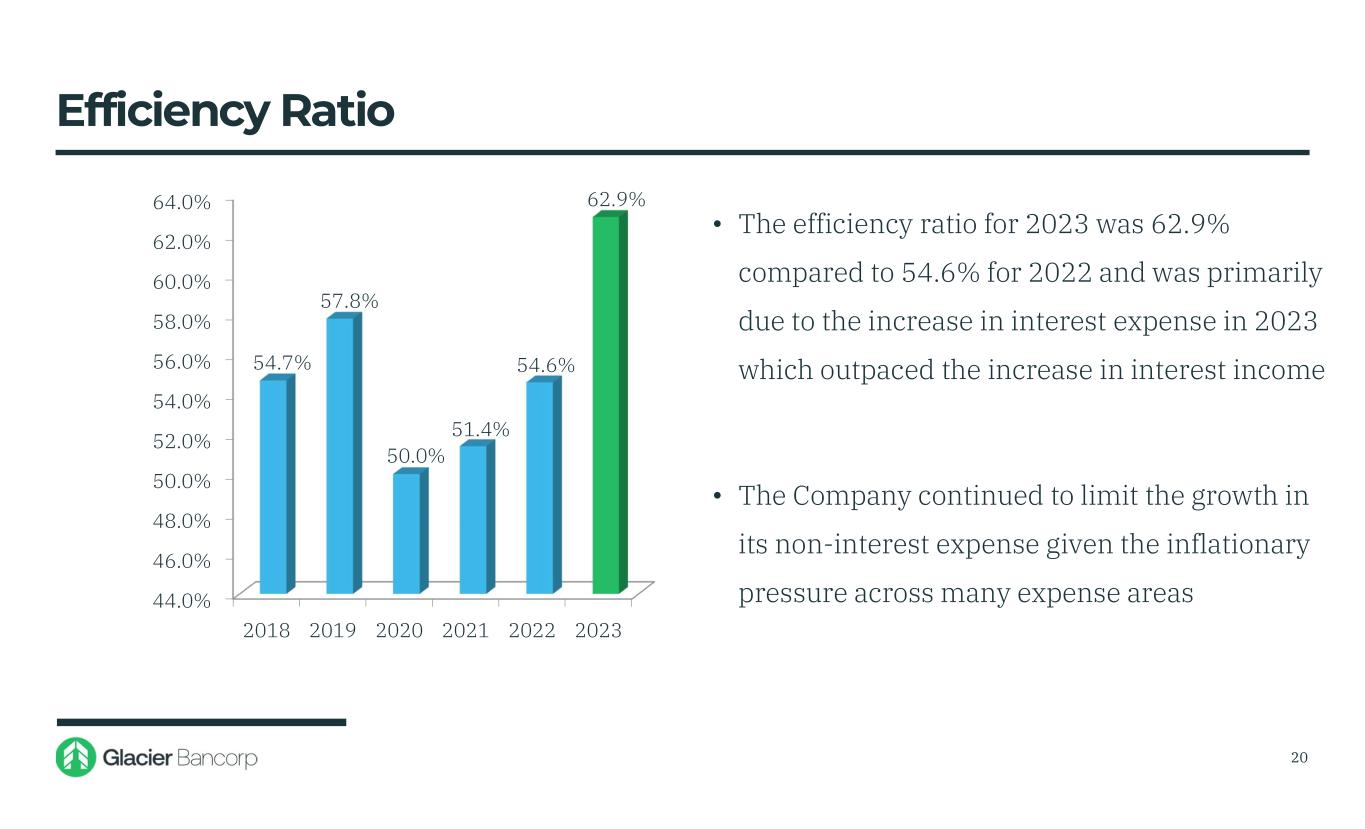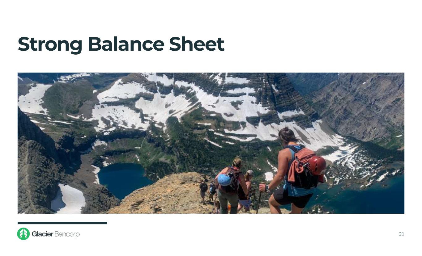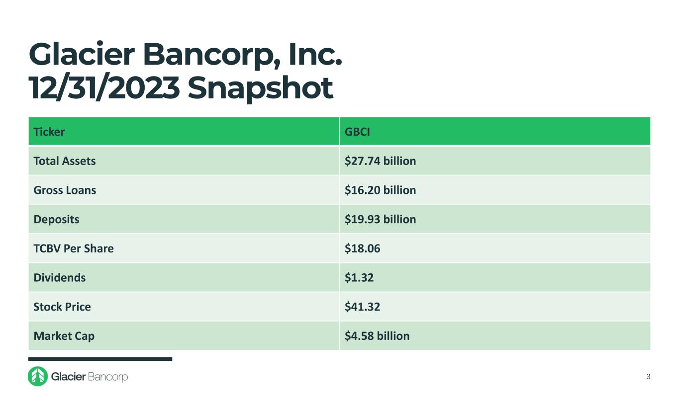 Glacier Bancorp, Inc. 12/31/2023 Snapshot Ticker GBCI Total Assets $27.74 billion Gross Loans $16.20 billion Deposits $19.93 billion TCBV Per Share $18.06 Dividends $1.32 Stock Price $41.32 Market Cap $4.58 billion 3