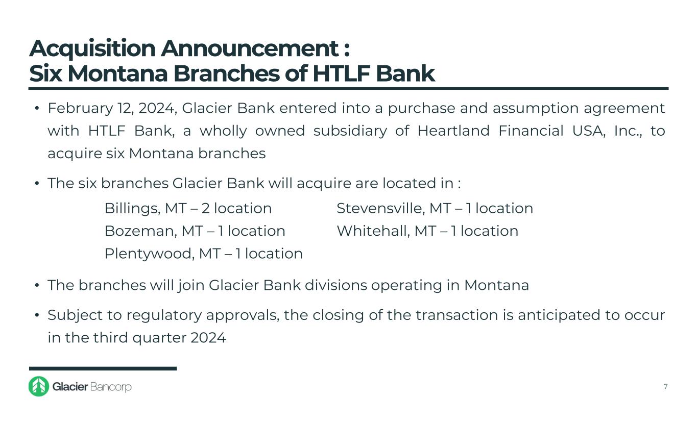 Community Financial Group, Inc. Acquisition Pro Forma Washington Branch Footprint• The acquisition is consistent with Glacier’s long-term strategy of buying good banks in good markets with good people • Establishes a market-leading Eastern Washington franchise • A new bank division, Wheatland Bank, will be formed upon combining with the North Cascades Bank division • The new Wheatland Bank division will be Glacier’s 7th largest division by asset size, with over $1.6 billion in assets and 250 employees • The acquisition complements GBCI’s existing strong loan and deposit portfolios and deepens its agricultural presence in one of the top Ag producing markets in the United States (1) Based on GBCI closing price of $33.97 as of August 7, 2023. (2) Based on required tangible book value of $49.2 million. (3) Based on FactSet Consensus estimates for GBCI and GBCI estimates for CFGW as of August 7, 2023. (4) Inclusive of all estimated restructuring charges. 6 Announcement Date August 8, 2023 Closing Date January 31, 2024 Transaction Overview Transaction Value ($ million) (1) $80.6 million Consideration Mix 100% Stock Transaction value / Tangible book Value (2) 161% Select Pro Forma Impact Projected 2024e EPS Accretion (with 50% Cost Savings Phase-In) (3) 3.4% Projected 2025e EPS Accretion (with 100% Cost Savings Phase-In) (3) 4.2% TBV Per Share Dilution (4) 0.4% TBV Per Share Payback Period < 1 Year Internal Rate of Return 15% + Target Market Market Expansion / New Market Eastern Washington (Expansion)