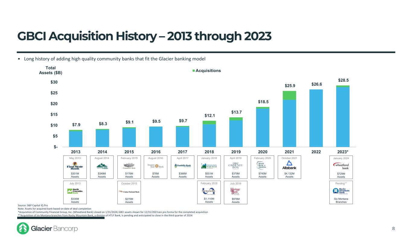 Acquisition Announcement : Six Montana Branches of HTLF Bank 7 • February 12, 2024, Glacier Bank entered into a purchase and assumption agreement with HTLF Bank, a wholly owned subsidiary of Heartland Financial USA, Inc., to acquire six Montana branches • The six branches Glacier Bank will acquire are located in : • The branches will join Glacier Bank divisions operating in Montana • Subject to regulatory approvals, the closing of the transaction is anticipated to occur in the third quarter 2024 Billings, MT – 2 location Stevensville, MT – 1 location Bozeman, MT – 1 location Whitehall, MT – 1 location Plentywood, MT – 1 location