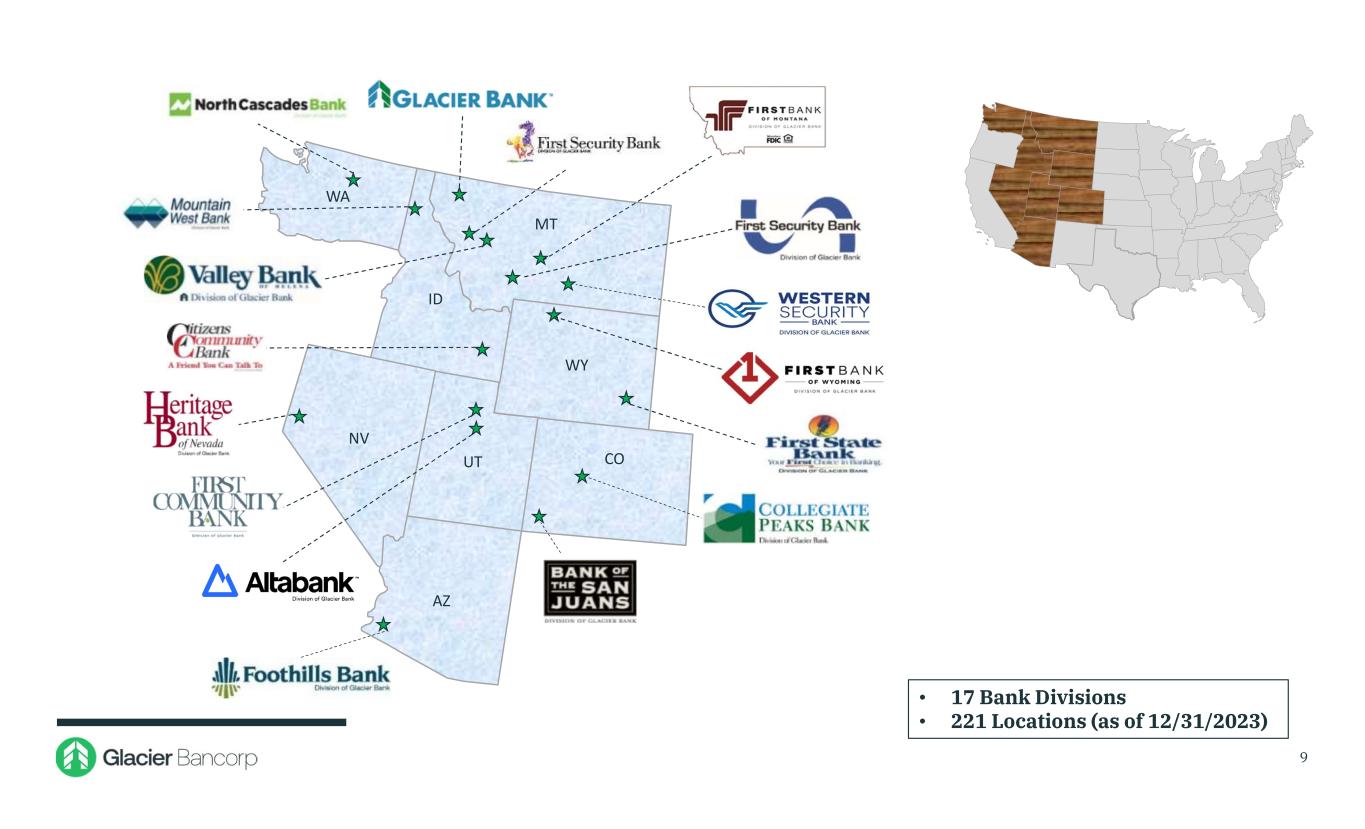 Pending** Six Montana Branches $7.9 $8.3 $9.1 $9.5 $9.7 $12.1 $13.7 $18.5 $25.9 $26.6 $28.5 $- $5 $10 $15 $20 $25 $30 2013 2014 2015 2016 2017 2018 2019 2020 2021 2022 2023* Total Assets ($B) Acquisitions GBCI Acquisition History – 2013 through 2023 8 • Long history of adding high quality community banks that fit the Glacier banking model May 2013 $301M Assets July 2013 $330M Assets August 2014 $349M Assets February 2015 $176M Assets October 2015 $270M Assets October 2021 $4,132M Assets July 2019 $978M Assets April 2017 $386M Assets April 2019 $379M Assets February 2018 $1,110M Assets January 2018 $551M Assets February 2020 $745M Assets August 2016 $76M Assets Source: S&P Capital IQ Pro Note: Assets for acquired bank based on date of deal completion *Acquisition of Community Financial Group, Inc. (Wheatland Bank) closed on 1/31/2024; GBCI assets shown for 12/31/2023 are pro forma for the completed acquisition **Acquisition of six Montana branches from Rocky Mountain Bank, a division of HTLF Bank, is pending and anticipated to close in the third quarter of 2024 January 2024 $729M Assets