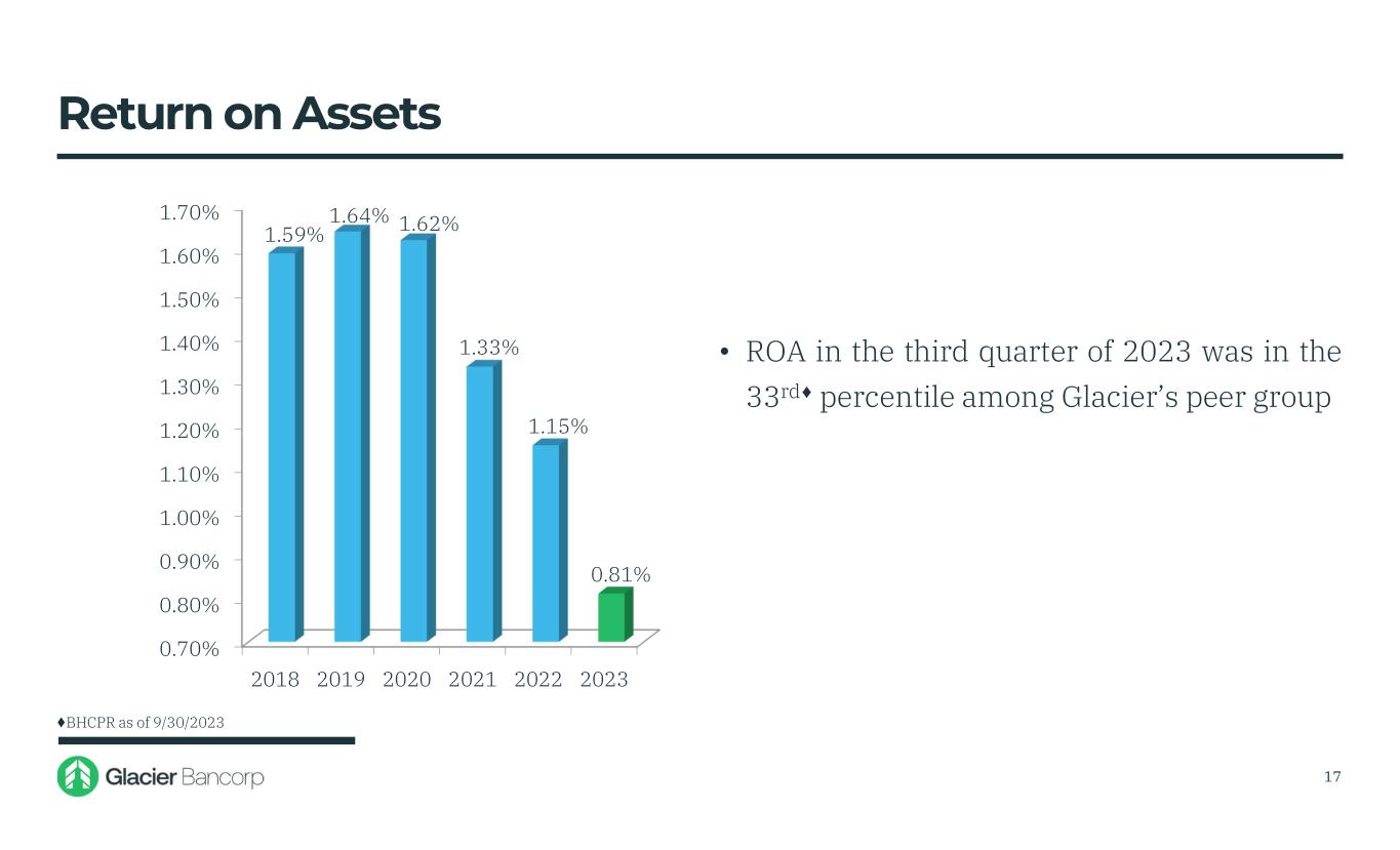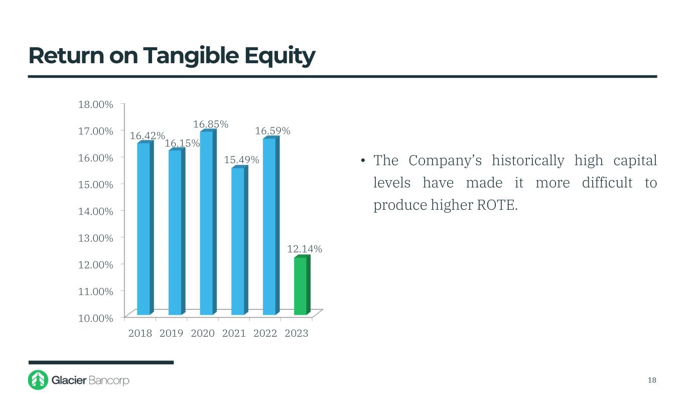 0.70% 0.80% 0.90% 1.00% 1.10% 1.20% 1.30% 1.40% 1.50% 1.60% 1.70% 2018 2019 2020 2021 2022 2023 1.64% 1.59% 1.62% 1.15% 0.81% • ROA in the third quarter of 2023 was in the 33rd♦ percentile among Glacier’s peer group 17 Return on Assets ♦BHCPR as of 9/30/2023 1.33%