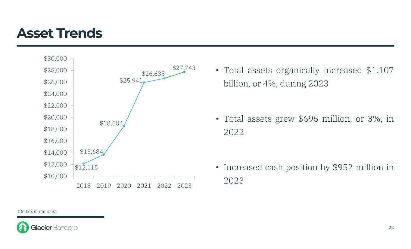 $12,115 $13,684 $18,504 $25,941 $26,635 $27,743 $10,000 $12,000 $14,000 $16,000 $18,000 $20,000 $22,000 $24,000 $26,000 $28,000 $30,000 2018 2019 2020 2021 2022 2023 • Total assets organically increased $1.107 billion, or 4%, during 2023 • Total assets grew $695 million, or 3%, in 2022 • Increased cash position by $952 million in 2023 22 Asset Trends (Dollars in millions)