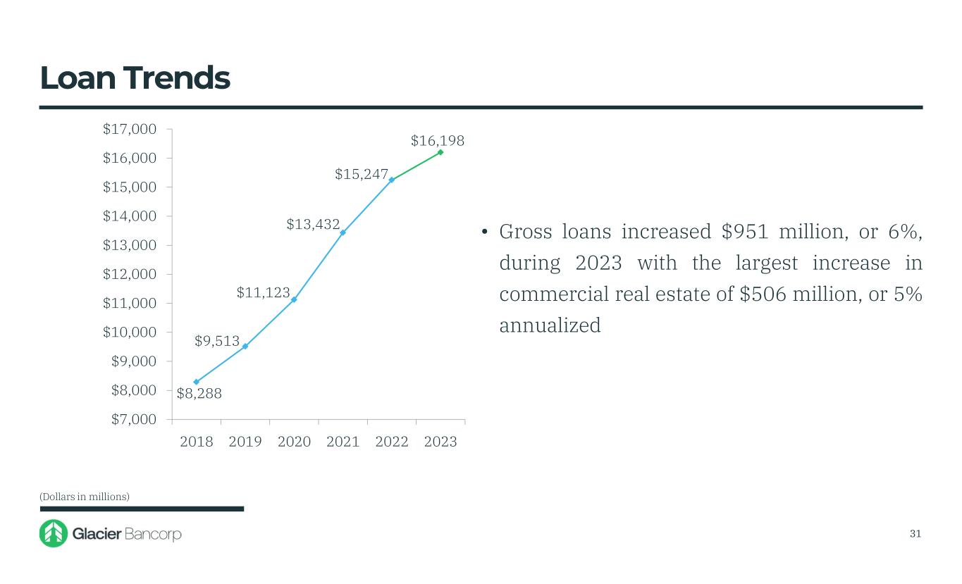 0.22% 0.24% 0.15% 0.09% 0.11% 1.00% 0.81% 1.10% 0.53% 0.21% 0.61% 2.29% 0.00% 0.50% 1.00% 1.50% 2.00% 2.50% Glacier Peers • Interest-bearing deposit cost increased to 1.17% at December 31, 2023 due to market dynamics and the competitive rate environment • Total deposit costs increased to 0.81% at December 31, 2023 from 0.07% at December 31, 2022 • Core deposits are a competitive advantage and will be a key driver of future performance 30 Interest-Bearing Deposit Cost Relative to Peers♦ ♦Graph based on BHCPR as of 9/30/2023