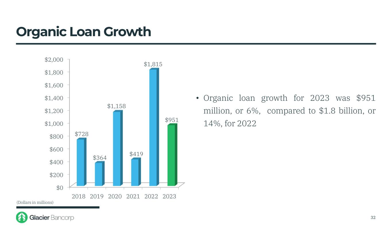 $8,288 $9,513 $11,123 $13,432 $15,247 $16,198 $7,000 $8,000 $9,000 $10,000 $11,000 $12,000 $13,000 $14,000 $15,000 $16,000 $17,000 2018 2019 2020 2021 2022 2023 • Gross loans increased $951 million, or 6%, during 2023 with the largest increase in commercial real estate of $506 million, or 5% annualized 31 Loan Trends (Dollars in millions)