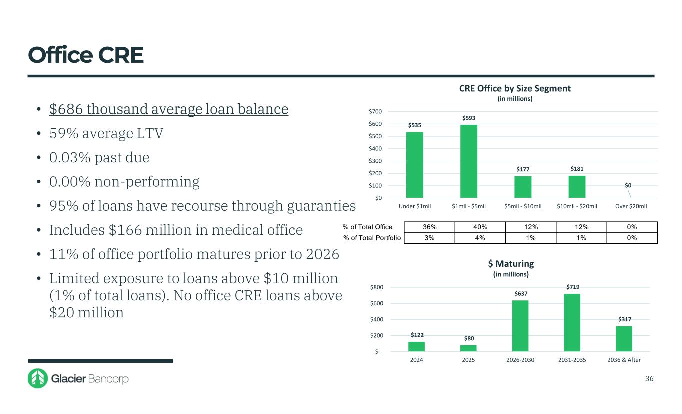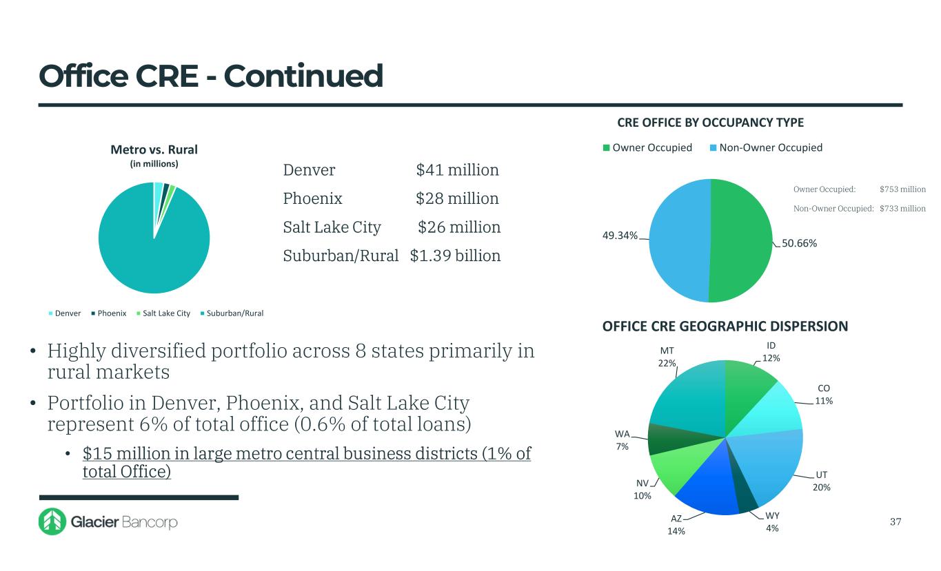 Office CRE • $686 thousand average loan balance • 59% average LTV • 0.03% past due • 0.00% non-performing • 95% of loans have recourse through guaranties • Includes $166 million in medical office • 11% of office portfolio matures prior to 2026 • Limited exposure to loans above $10 million (1% of total loans). No office CRE loans above $20 million 36 % of Total Office 36% 40% 12% 12% 0% % of Total Portfolio 3% 4% 1% 1% 0% $535 $593 $177 $181 $0 $0 $100 $200 $300 $400 $500 $600 $700 Under $1mil $1mil - $5mil $5mil - $10mil $10mil - $20mil Over $20mil CRE Office by Size Segment (in millions) $122 $80 $637 $719 $317 $- $200 $400 $600 $800 2024 2025 2026-2030 2031-2035 2036 & After $ Maturing (in millions)