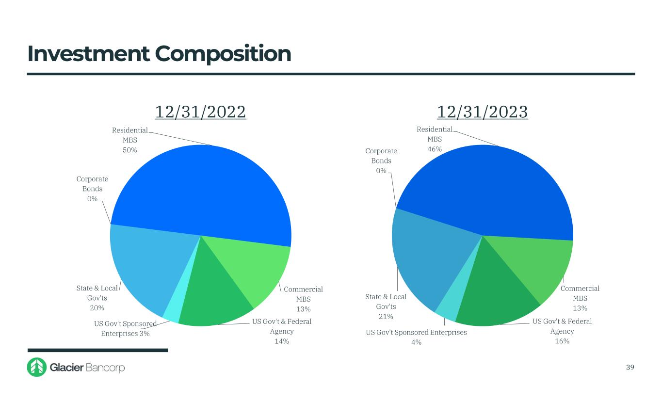 US Gov't & Federal Agency 14% US Gov't Sponsored Enterprises 3% State & Local Gov'ts 20% Corporate Bonds 0% Residential MBS 50% Commercial MBS 13% 12/31/2022 US Gov't & Federal Agency 16% US Gov't Sponsored Enterprises 4% State & Local Gov'ts 21% Corporate Bonds 0% Residential MBS 46% Commercial MBS 13% 12/31/2023 39 Investment Composition
