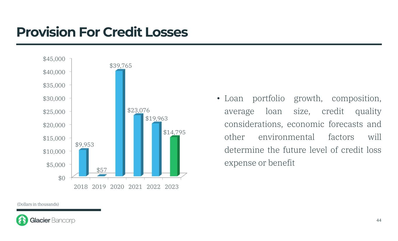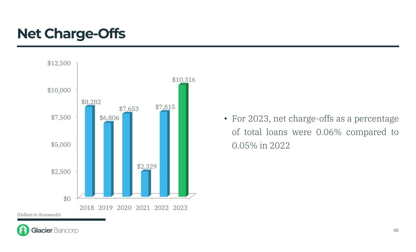 $0 $5,000 $10,000 $15,000 $20,000 $25,000 $30,000 $35,000 $40,000 $45,000 2018 2019 2020 2021 2022 2023 $9,953 $57 $39,765 $23,076 $19,963 $14,795 • Loan portfolio growth, composition, average loan size, credit quality considerations, economic forecasts and other environmental factors will determine the future level of credit loss expense or benefit 44 Provision For Credit Losses (Dollars in thousands)