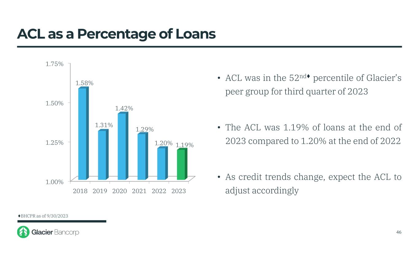 1.00% 1.25% 1.50% 1.75% 2018 2019 2020 2021 2022 2023 1.58% 1.31% 1.42% 1.29% 1.20% 1.19% • ACL was in the 52nd♦ percentile of Glacier’s peer group for third quarter of 2023 • The ACL was 1.19% of loans at the end of 2023 compared to 1.20% at the end of 2022 • As credit trends change, expect the ACL to adjust accordingly 46 ACL as a Percentage of Loans ♦BHCPR as of 9/30/2023