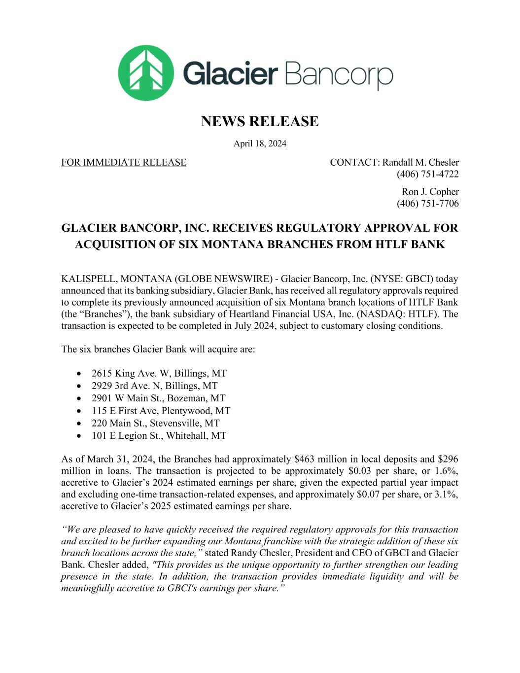 NEWS RELEASE April 18, 2024 FOR IMMEDIATE RELEASE CONTACT: Randall M. Chesler (406) 751-4722 Ron J. Copher (406) 751-7706 GLACIER BANCORP, INC. RECEIVES REGULATORY APPROVAL FOR ACQUISITION OF SIX MONTANA BRANCHES FROM HTLF BANK KALISPELL, MONTANA (GLOBE NEWSWIRE) - Glacier Bancorp, Inc. (NYSE: GBCI) today announced that its banking subsidiary, Glacier Bank, has received all regulatory approvals required to complete its previously announced acquisition of six Montana branch locations of HTLF Bank (the “Branches”), the bank subsidiary of Heartland Financial USA, Inc. (NASDAQ: HTLF). The transaction is expected to be completed in July 2024, subject to customary closing conditions. The six branches Glacier Bank will acquire are:  2615 King Ave. W, Billings, MT  2929 3rd Ave. N, Billings, MT  2901 W Main St., Bozeman, MT  115 E First Ave, Plentywood, MT  220 Main St., Stevensville, MT  101 E Legion St., Whitehall, MT As of March 31, 2024, the Branches had approximately $463 million in local deposits and $296 million in loans. The transaction is projected to be approximately $0.03 per share, or 1.6%, accretive to Glacier’s 2024 estimated earnings per share, given the expected partial year impact and excluding one-time transaction-related expenses, and approximately $0.07 per share, or 3.1%, accretive to Glacier’s 2025 estimated earnings per share. “We are pleased to have quickly received the required regulatory approvals for this transaction and excited to be further expanding our Montana franchise with the strategic addition of these six branch locations across the state,” stated Randy Chesler, President and CEO of GBCI and Glacier Bank. Chesler added, "This provides us the unique opportunity to further strengthen our leading presence in the state. In addition, the transaction provides immediate liquidity and will be meaningfully accretive to GBCI's earnings per share.”