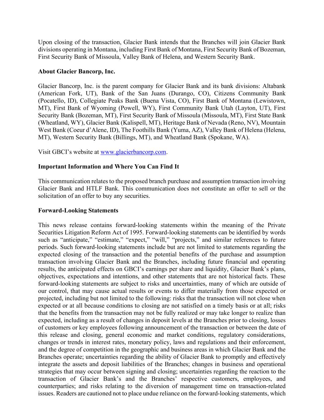 Upon closing of the transaction, Glacier Bank intends that the Branches will join Glacier Bank divisions operating in Montana, including First Bank of Montana, First Security Bank of Bozeman, First Security Bank of Missoula, Valley Bank of Helena, and Western Security Bank. About Glacier Bancorp, Inc. Glacier Bancorp, Inc. is the parent company for Glacier Bank and its bank divisions: Altabank (American Fork, UT), Bank of the San Juans (Durango, CO), Citizens Community Bank (Pocatello, ID), Collegiate Peaks Bank (Buena Vista, CO), First Bank of Montana (Lewistown, MT), First Bank of Wyoming (Powell, WY), First Community Bank Utah (Layton, UT), First Security Bank (Bozeman, MT), First Security Bank of Missoula (Missoula, MT), First State Bank (Wheatland, WY), Glacier Bank (Kalispell, MT), Heritage Bank of Nevada (Reno, NV), Mountain West Bank (Coeur d’Alene, ID), The Foothills Bank (Yuma, AZ), Valley Bank of Helena (Helena, MT), Western Security Bank (Billings, MT), and Wheatland Bank (Spokane, WA). Visit GBCI’s website at www.glacierbancorp.com. Important Information and Where You Can Find It This communication relates to the proposed branch purchase and assumption transaction involving Glacier Bank and HTLF Bank. This communication does not constitute an offer to sell or the solicitation of an offer to buy any securities. Forward-Looking Statements This news release contains forward-looking statements within the meaning of the Private Securities Litigation Reform Act of 1995. Forward-looking statements can be identified by words such as “anticipate,” “estimate,” “expect,” “will,” “projects,” and similar references to future periods. Such forward-looking statements include but are not limited to statements regarding the expected closing of the transaction and the potential benefits of the purchase and assumption transaction involving Glacier Bank and the Branches, including future financial and operating results, the anticipated effects on GBCI’s earnings per share and liquidity, Glacier Bank’s plans, objectives, expectations and intentions, and other statements that are not historical facts. These forward-looking statements are subject to risks and uncertainties, many of which are outside of our control, that may cause actual results or events to differ materially from those expected or projected, including but not limited to the following: risks that the transaction will not close when expected or at all because conditions to closing are not satisfied on a timely basis or at all; risks that the benefits from the transaction may not be fully realized or may take longer to realize than expected, including as a result of changes in deposit levels at the Branches prior to closing, losses of customers or key employees following announcement of the transaction or between the date of this release and closing, general economic and market conditions, regulatory considerations, changes or trends in interest rates, monetary policy, laws and regulations and their enforcement, and the degree of competition in the geographic and business areas in which Glacier Bank and the Branches operate; uncertainties regarding the ability of Glacier Bank to promptly and effectively integrate the assets and deposit liabilities of the Branches; changes in business and operational strategies that may occur between signing and closing; uncertainties regarding the reaction to the transaction of Glacier Bank’s and the Branches’ respective customers, employees, and counterparties; and risks relating to the diversion of management time on transaction-related issues. Readers are cautioned not to place undue reliance on the forward-looking statements, which