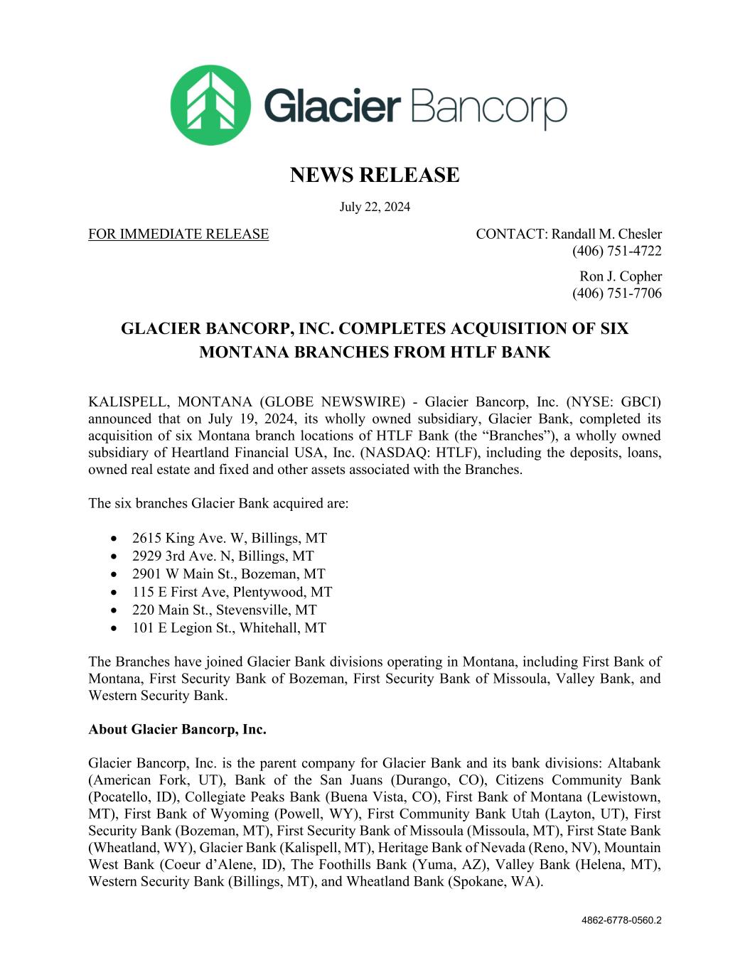 4862-6778-0560.2 NEWS RELEASE July 22, 2024 FOR IMMEDIATE RELEASE CONTACT: Randall M. Chesler (406) 751-4722 Ron J. Copher (406) 751-7706 GLACIER BANCORP, INC. COMPLETES ACQUISITION OF SIX MONTANA BRANCHES FROM HTLF BANK KALISPELL, MONTANA (GLOBE NEWSWIRE) - Glacier Bancorp, Inc. (NYSE: GBCI) announced that on July 19, 2024, its wholly owned subsidiary, Glacier Bank, completed its acquisition of six Montana branch locations of HTLF Bank (the “Branches”), a wholly owned subsidiary of Heartland Financial USA, Inc. (NASDAQ: HTLF), including the deposits, loans, owned real estate and fixed and other assets associated with the Branches. The six branches Glacier Bank acquired are:  2615 King Ave. W, Billings, MT  2929 3rd Ave. N, Billings, MT  2901 W Main St., Bozeman, MT  115 E First Ave, Plentywood, MT  220 Main St., Stevensville, MT  101 E Legion St., Whitehall, MT The Branches have joined Glacier Bank divisions operating in Montana, including First Bank of Montana, First Security Bank of Bozeman, First Security Bank of Missoula, Valley Bank, and Western Security Bank. About Glacier Bancorp, Inc. Glacier Bancorp, Inc. is the parent company for Glacier Bank and its bank divisions: Altabank (American Fork, UT), Bank of the San Juans (Durango, CO), Citizens Community Bank (Pocatello, ID), Collegiate Peaks Bank (Buena Vista, CO), First Bank of Montana (Lewistown, MT), First Bank of Wyoming (Powell, WY), First Community Bank Utah (Layton, UT), First Security Bank (Bozeman, MT), First Security Bank of Missoula (Missoula, MT), First State Bank (Wheatland, WY), Glacier Bank (Kalispell, MT), Heritage Bank of Nevada (Reno, NV), Mountain West Bank (Coeur d’Alene, ID), The Foothills Bank (Yuma, AZ), Valley Bank (Helena, MT), Western Security Bank (Billings, MT), and Wheatland Bank (Spokane, WA).